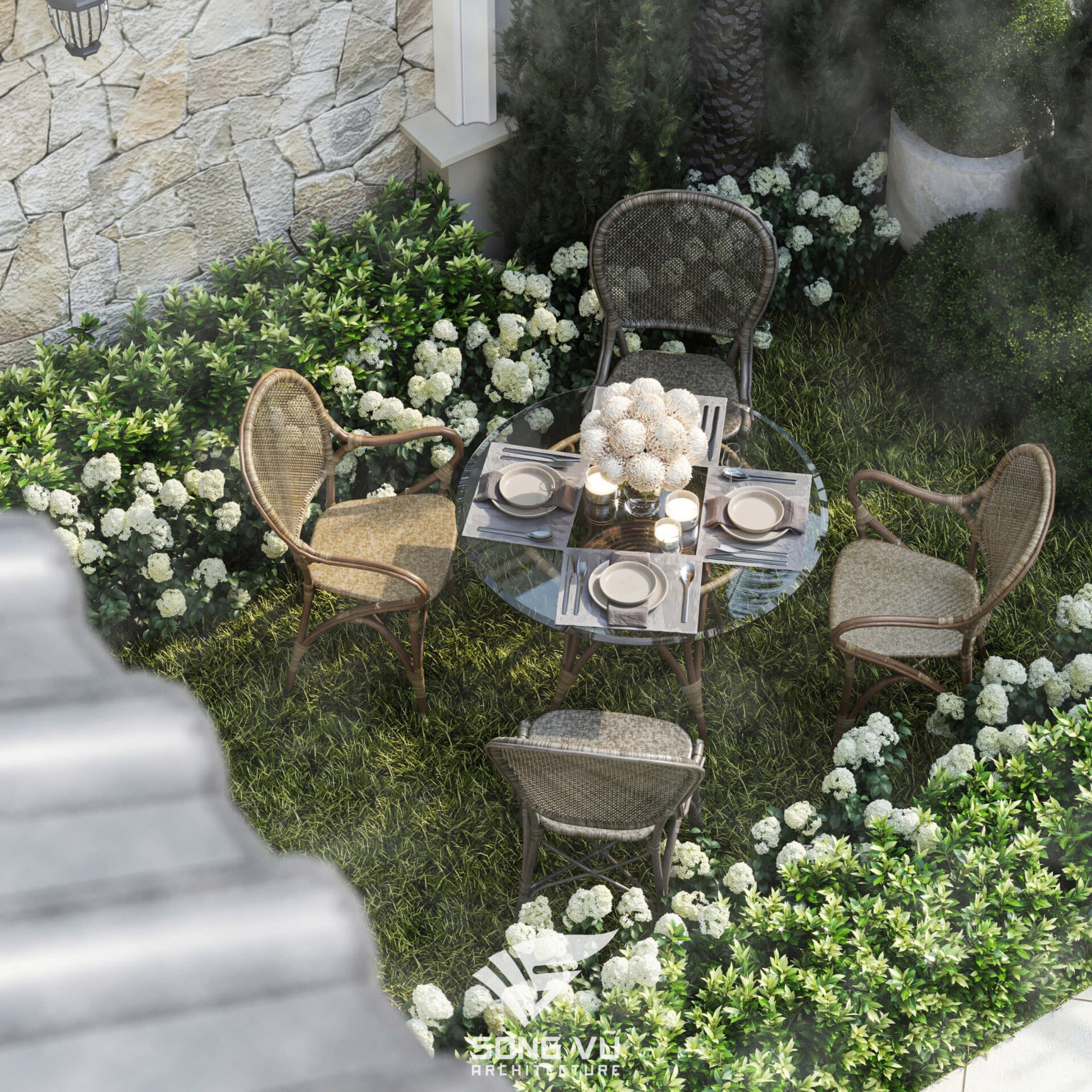 Ngoại thất không thể tách rời cảnh quan. Khuôn viên được bố trí cây xanh, tiểu cảnh gọn gàng, mang lại cảm giác nghỉ dưỡng và thư thái. Hàng rào xây kết hợp sắt mỹ thuật giúp đảm bảo an ninh nhưng vẫn giữ được sự thông thoáng, sang trọng cho mặt tiền.
