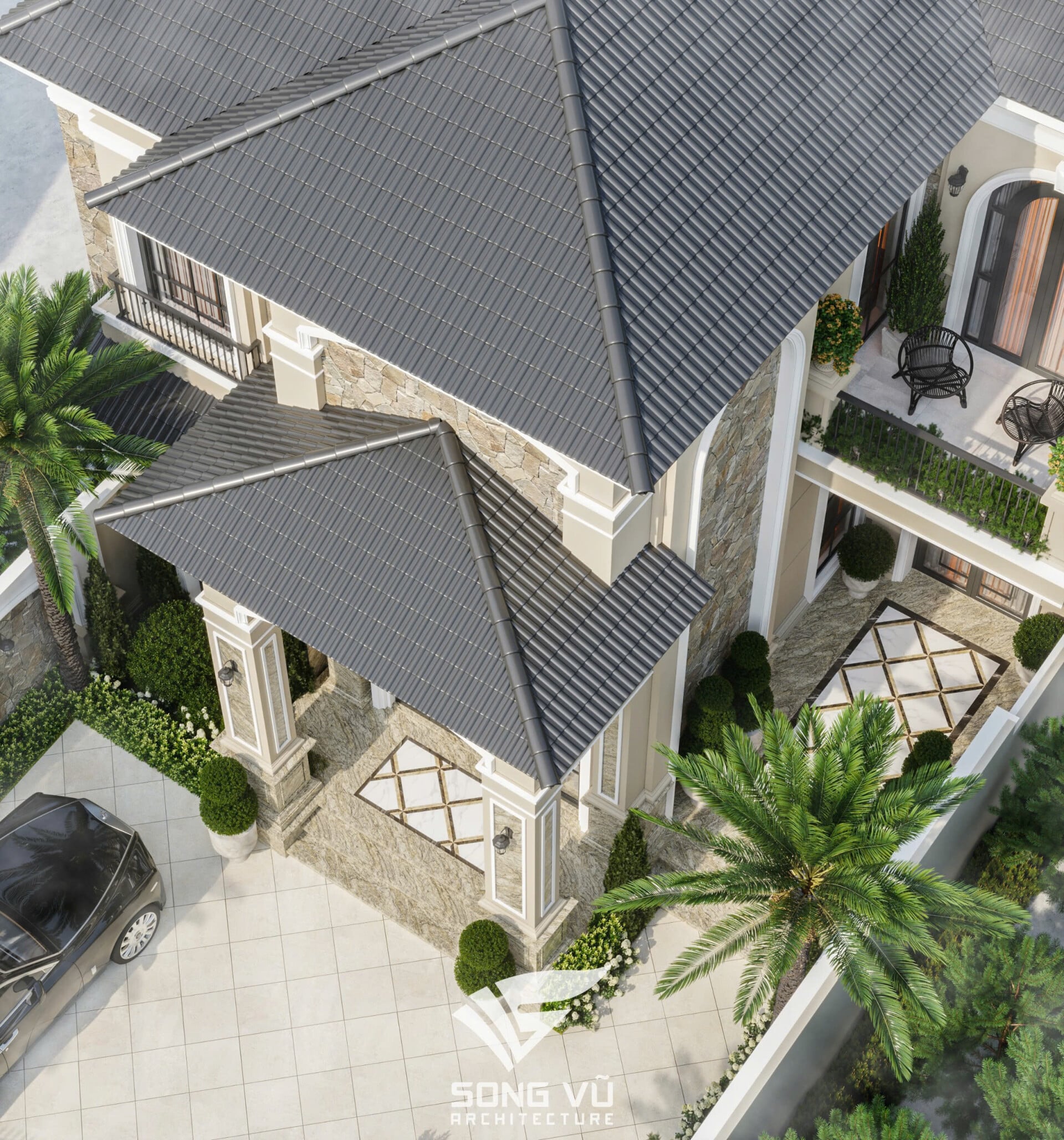 Hệ mái dốc lợp ngói màu xám đậm là điểm nhấn quan trọng, giúp công trình vừa mang dáng dấp cổ điển, vừa đảm bảo khả năng thoát nước và chống nóng hiệu quả. Kiểu mái này không chỉ có giá trị thẩm mỹ mà còn rất phù hợp với điều kiện khí hậu Việt Nam.