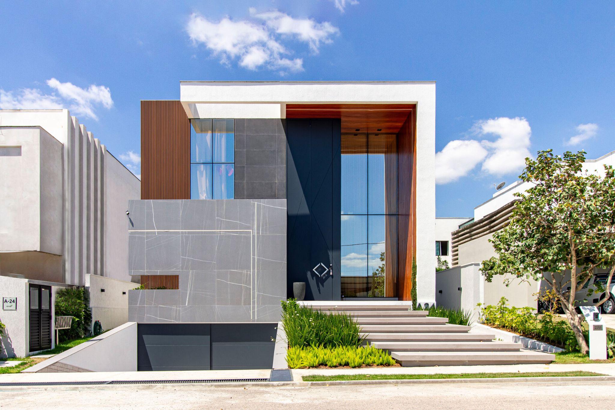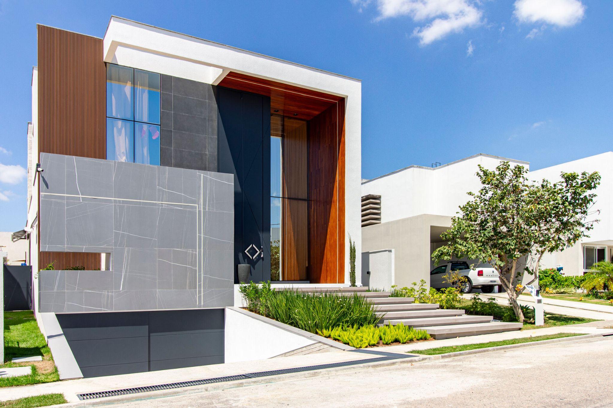 Mặt tiền biệt thự Casa Essência nổi bật với khối hộp xếp lớp màu xám - trắng và khung gỗ ấm ở lối vào. Cách phối vật liệu tương phản giúp mặt đứng vừa hiện đại, vừa có chiều sâu thị giác