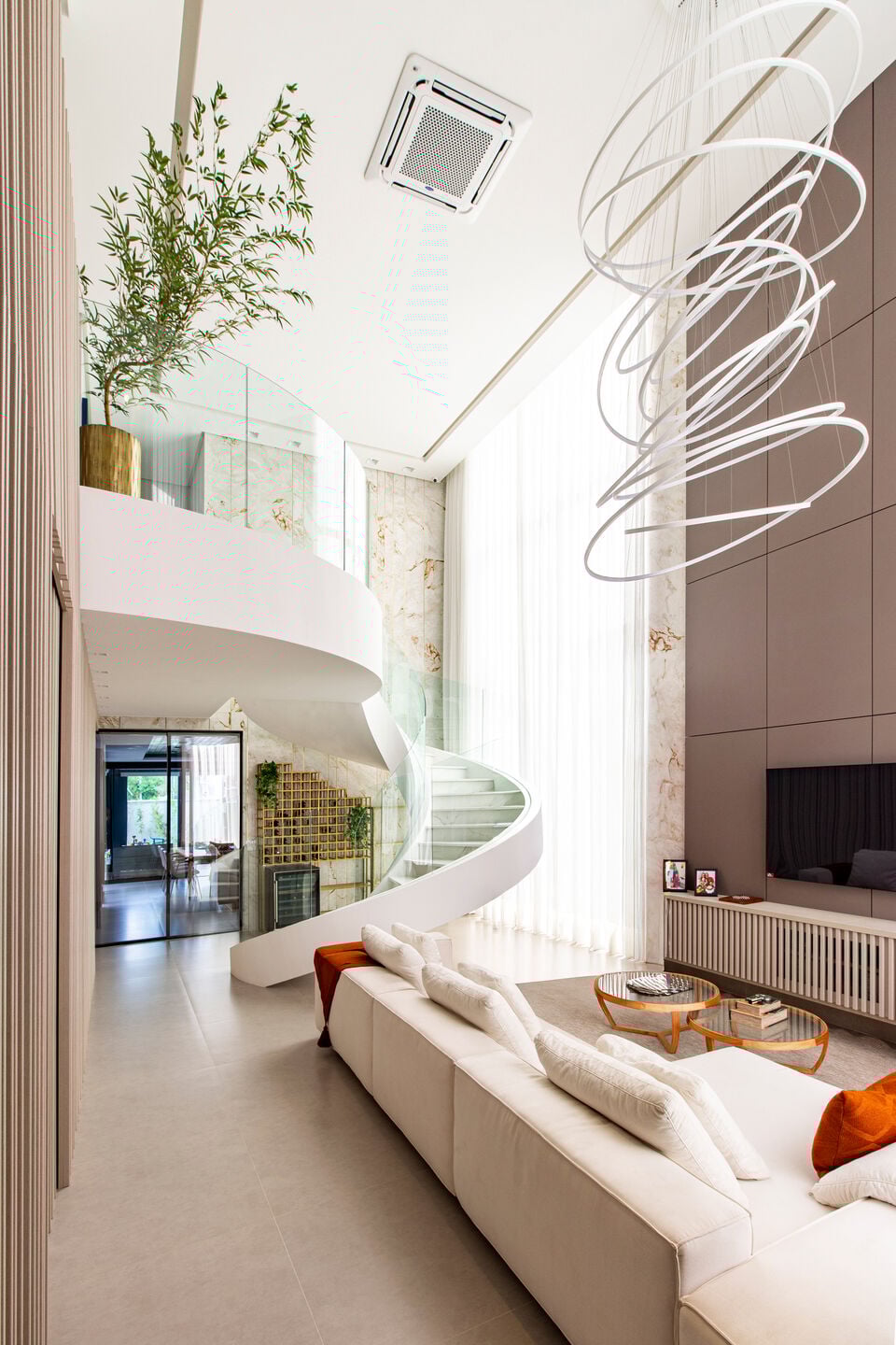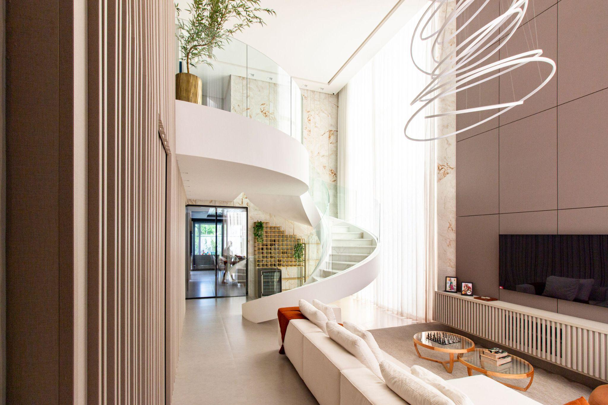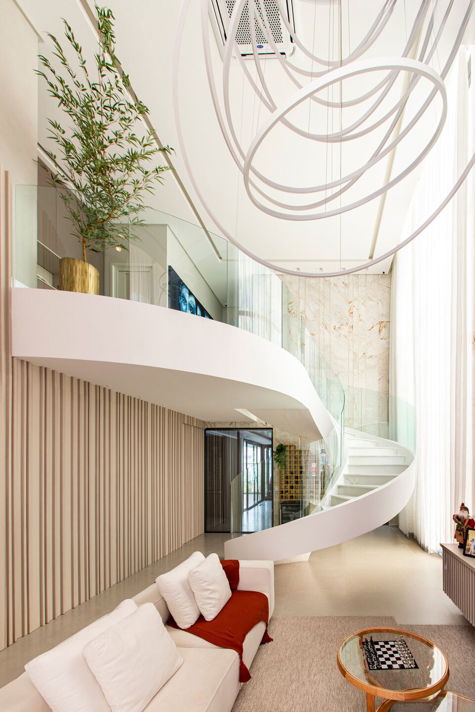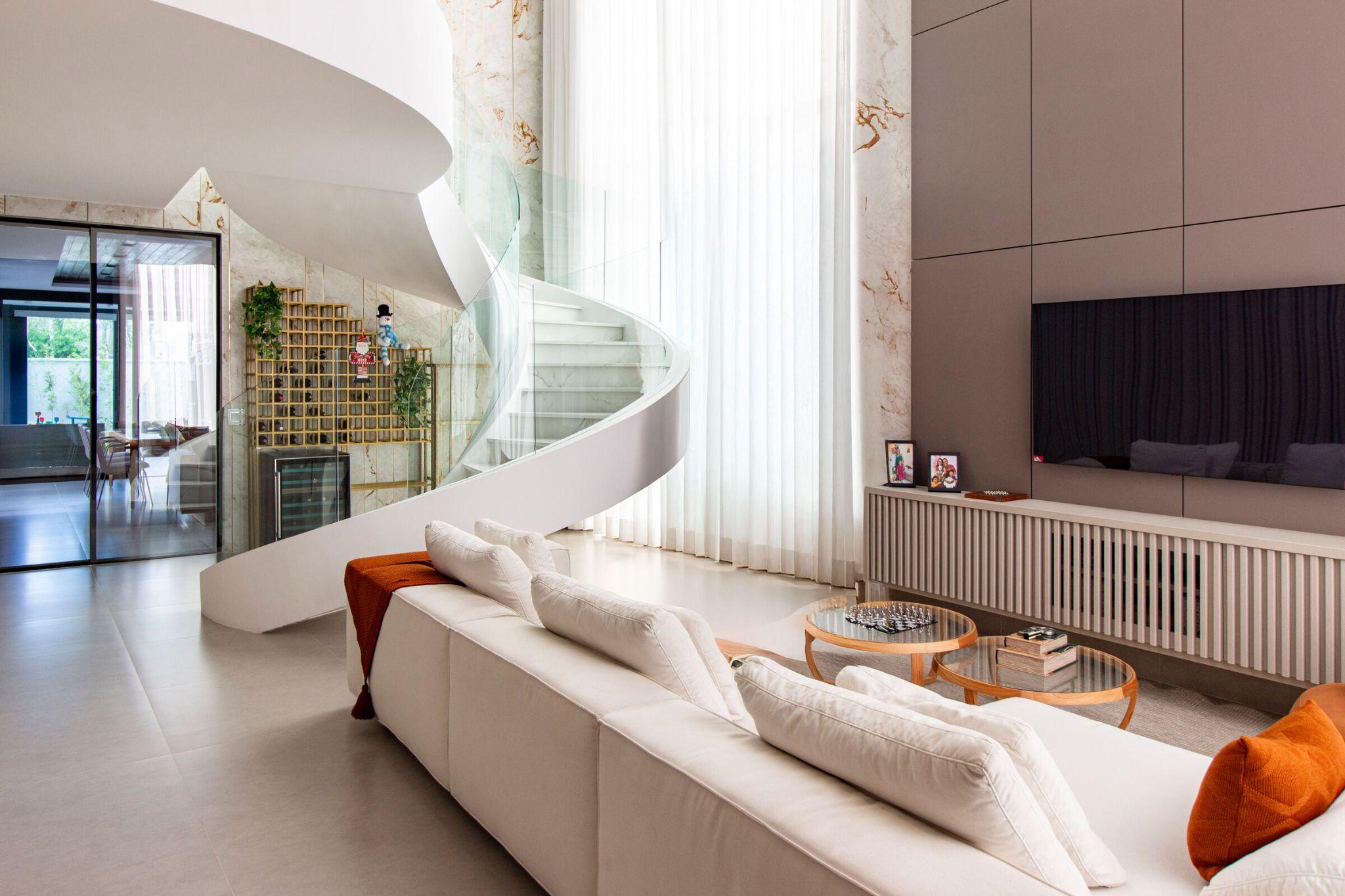 Ở trung tâm là sảnh thông tầng với cầu thang xoắn ốc ốp đá cẩm thạch trắng, đi cùng lan can kính trong suốt. Dưới ánh sáng tự nhiên, đường cong của thang trở thành “nét mềm” cân bằng các khối hộp mạnh mẽ xung quanh. Đây không chỉ là lối giao thông mà còn là chi tiết để nhớ về ngôi nhà: một tác phẩm điêu khắc nhẹ nhàng, thanh thoát, tạo ra nhịp điệu chuyển động cho toàn bộ không gian.