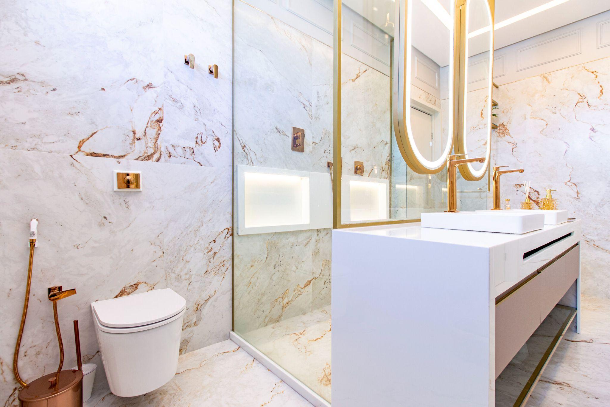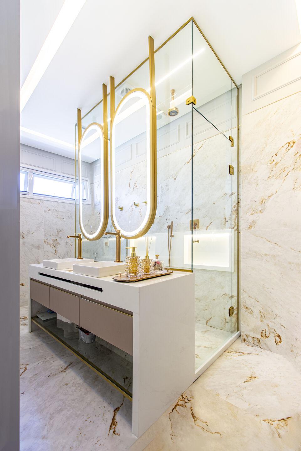Phòng tắm lát đá marble sáng kết hợp khung vàng ánh kim tạo cảm giác sang trọng. Hệ gương đôi bo cong và đèn hắt sáng giúp không gian trở nên mềm mại và ấm áp