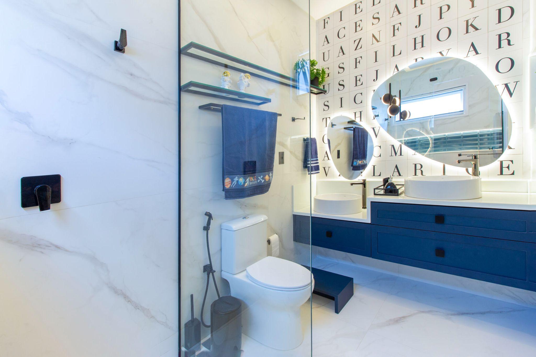 Phòng tắm trẻ em sử dụng tông xanh navy kết hợp gạch trắng và chữ in trang trí tường. Gương bo tròn lớn với ánh sáng hắt sau giúp không gian nhỏ vẫn sáng và sinh động