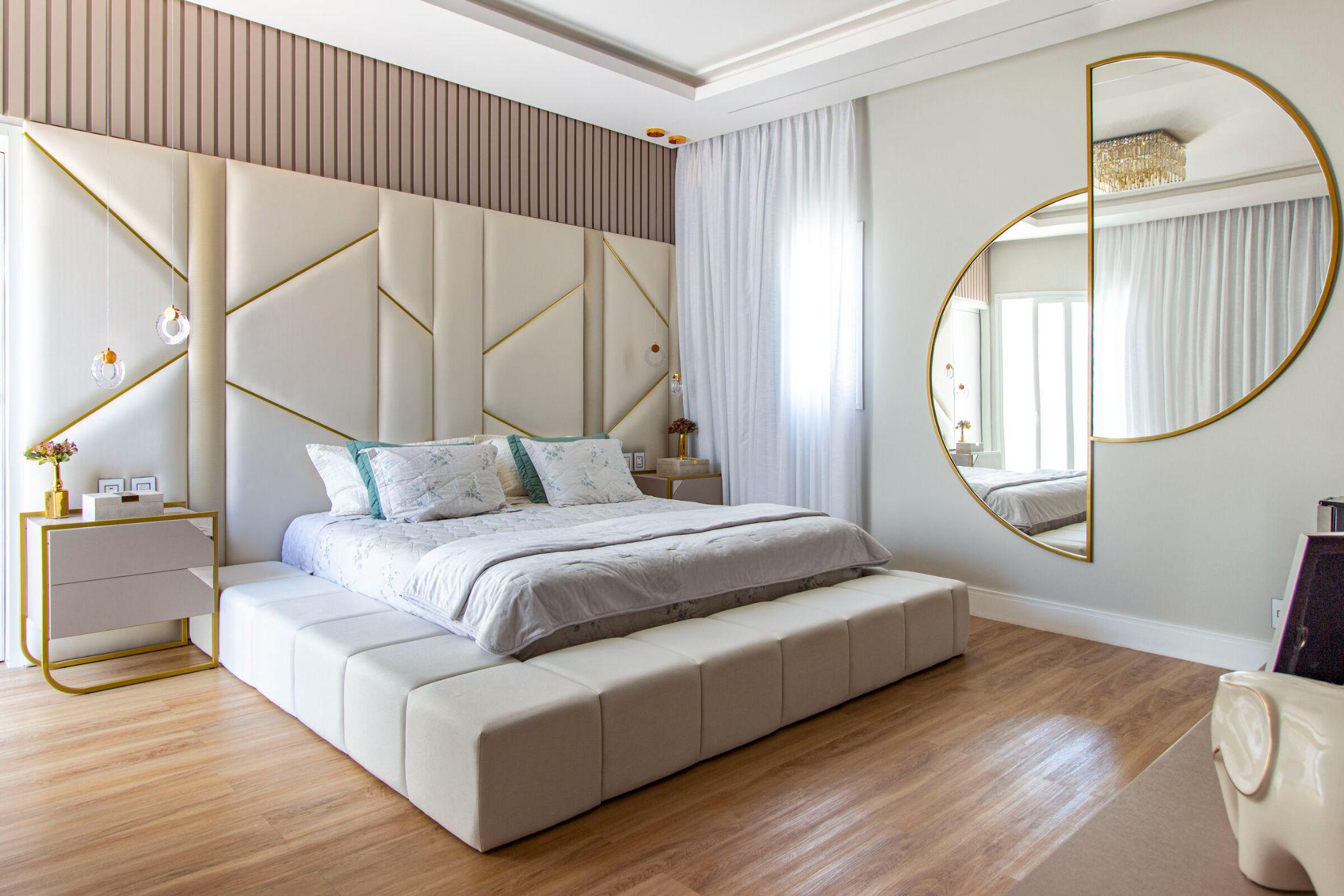 Phòng ngủ chính hiện đại với tường đầu giường bọc nệm chia mảng và đường viền vàng ánh kim. Chiếc gương tròn đôi đối xứng tạo hiệu ứng mở rộng, giúp căn phòng vừa sang trọng vừa tinh tế