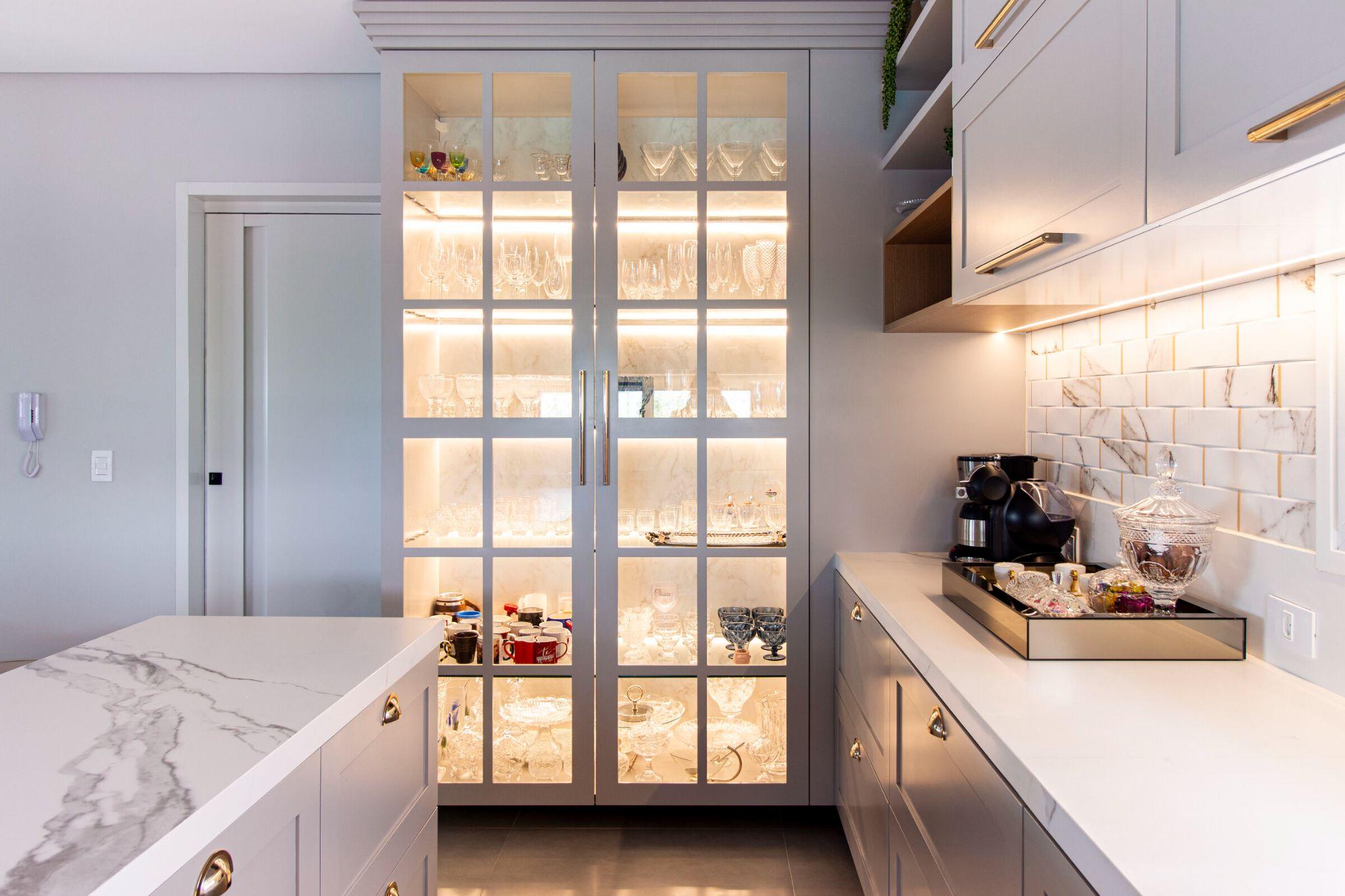 Tủ ly cao kịch trần với ánh sáng âm vàng nổi bật giữa khu bếp hiện đại. Thiết kế tủ kính giúp khoe khéo bộ sưu tập ly tách, đồng thời tăng chiều sâu cho không gian