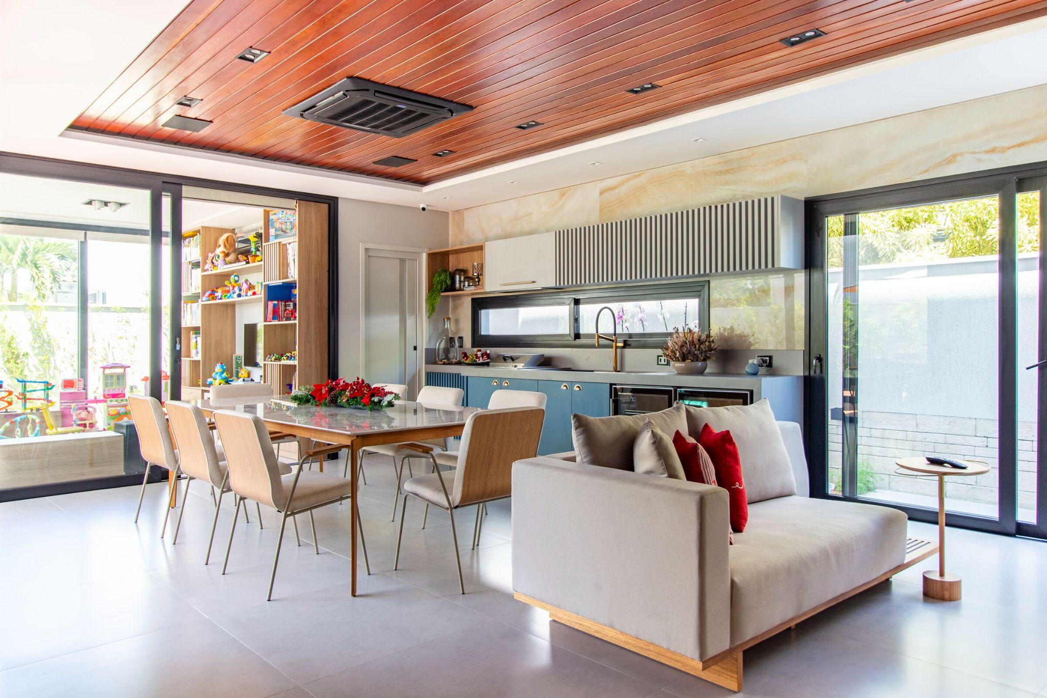 Không gian bếp - ăn mở, kết nối ra sân vườn qua hệ cửa kính trượt. Sự phối hợp giữa gỗ ấm, kim loại vàng và màu xanh lam tạo cảm giác hiện đại nhưng vẫn thân thiện