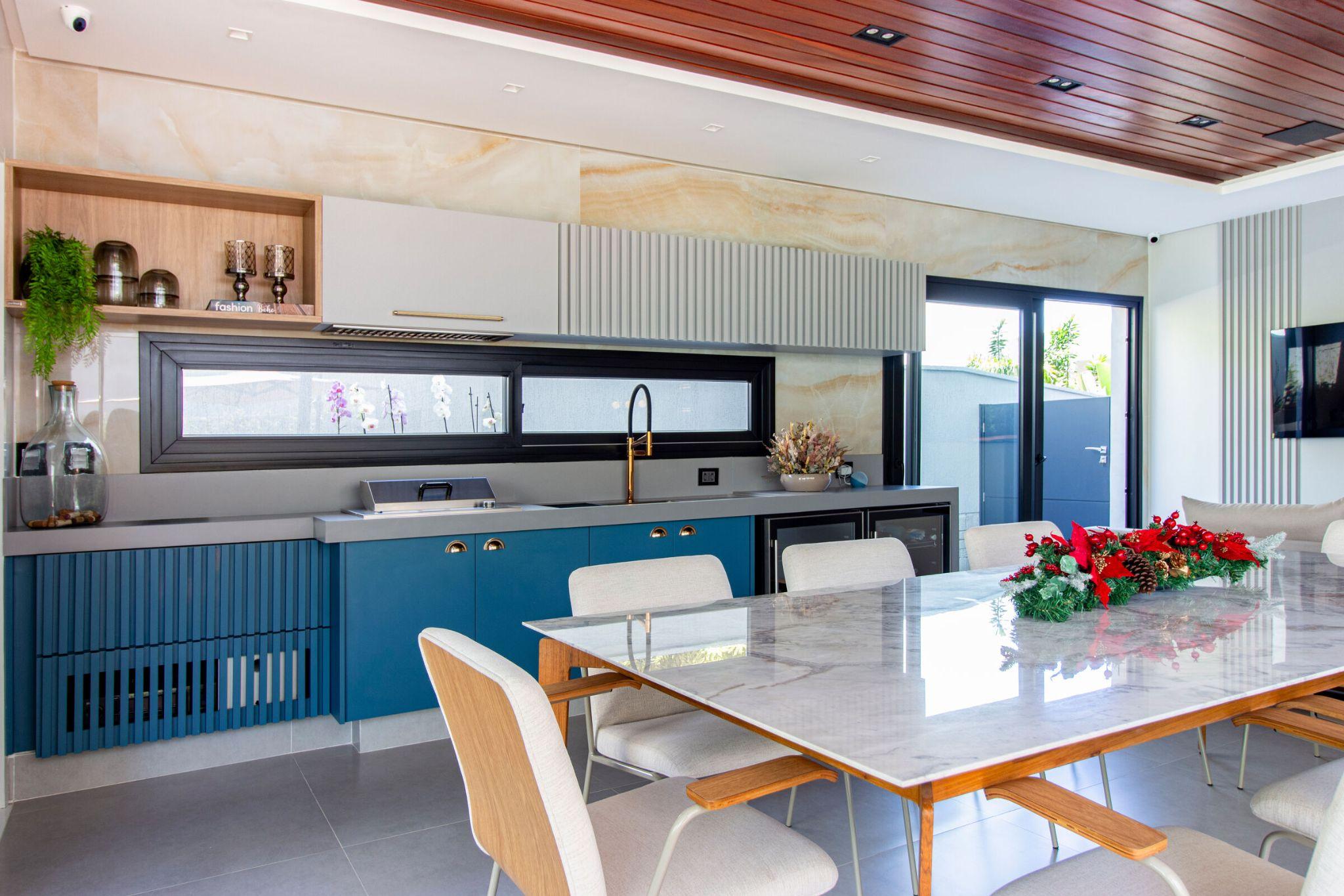 Khu bếp gourmet kết hợp bàn ăn lớn, dùng màu xanh lam và gỗ tự nhiên tạo điểm nhấn hiện đại. Thiết kế mở hướng ra sân giúp khu bếp luôn sáng, dễ thông gió