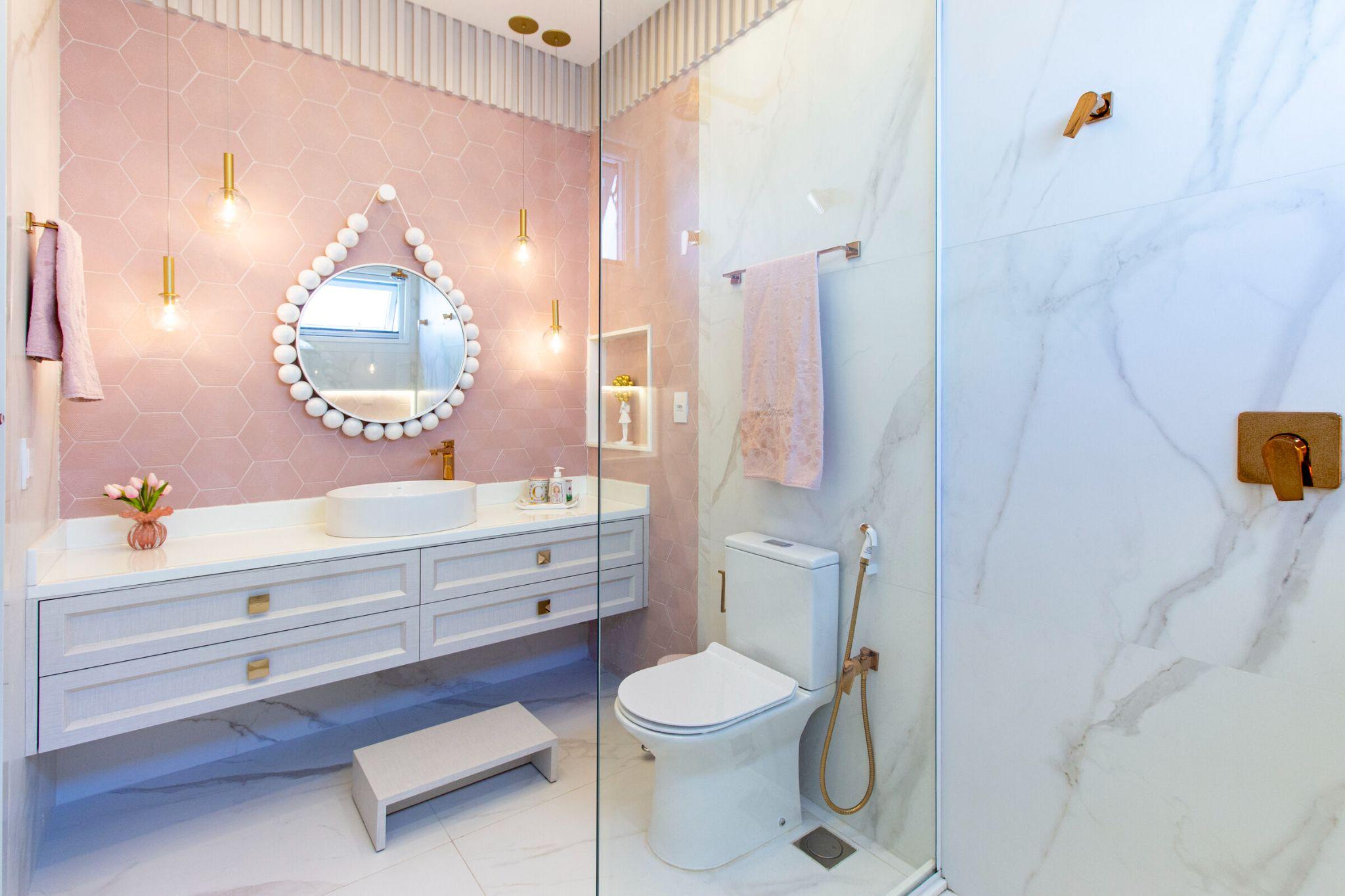 Phòng tắm nữ tính với tông hồng pastel và gương tròn bo viền bi độc đáo. Ánh sáng vàng nhẹ cùng chất liệu marble trắng mang lại cảm giác thư giãn, dịu mắt