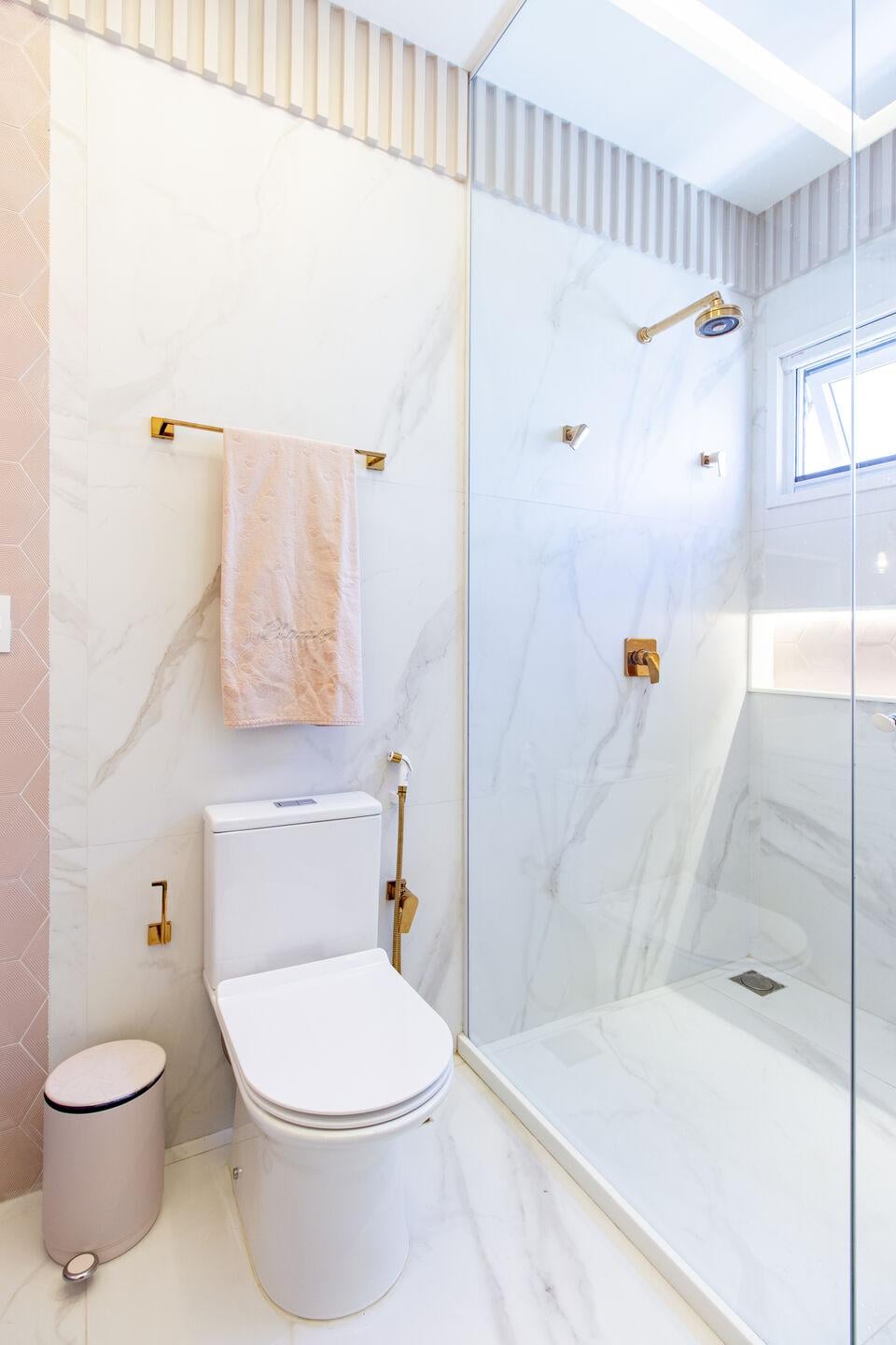 Phòng tắm sử dụng vách kính trong và vật liệu sáng màu để mở rộng cảm giác không gian. Các chi tiết mạ vàng mang lại nét hiện đại và tinh tế