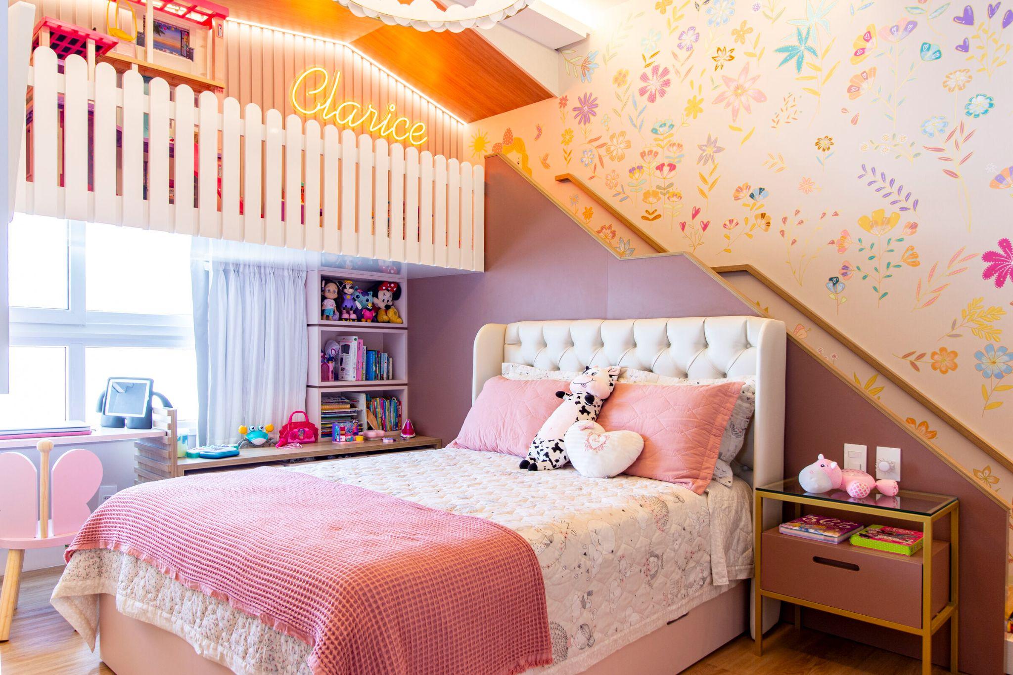 Phòng ngủ bé gái nổi bật với giấy dán tường hoa và tầng lửng gỗ nhỏ phía trên giường. Màu hồng phấn chủ đạo tạo cảm giác ấm áp, đáng yêu và giàu năng lượng