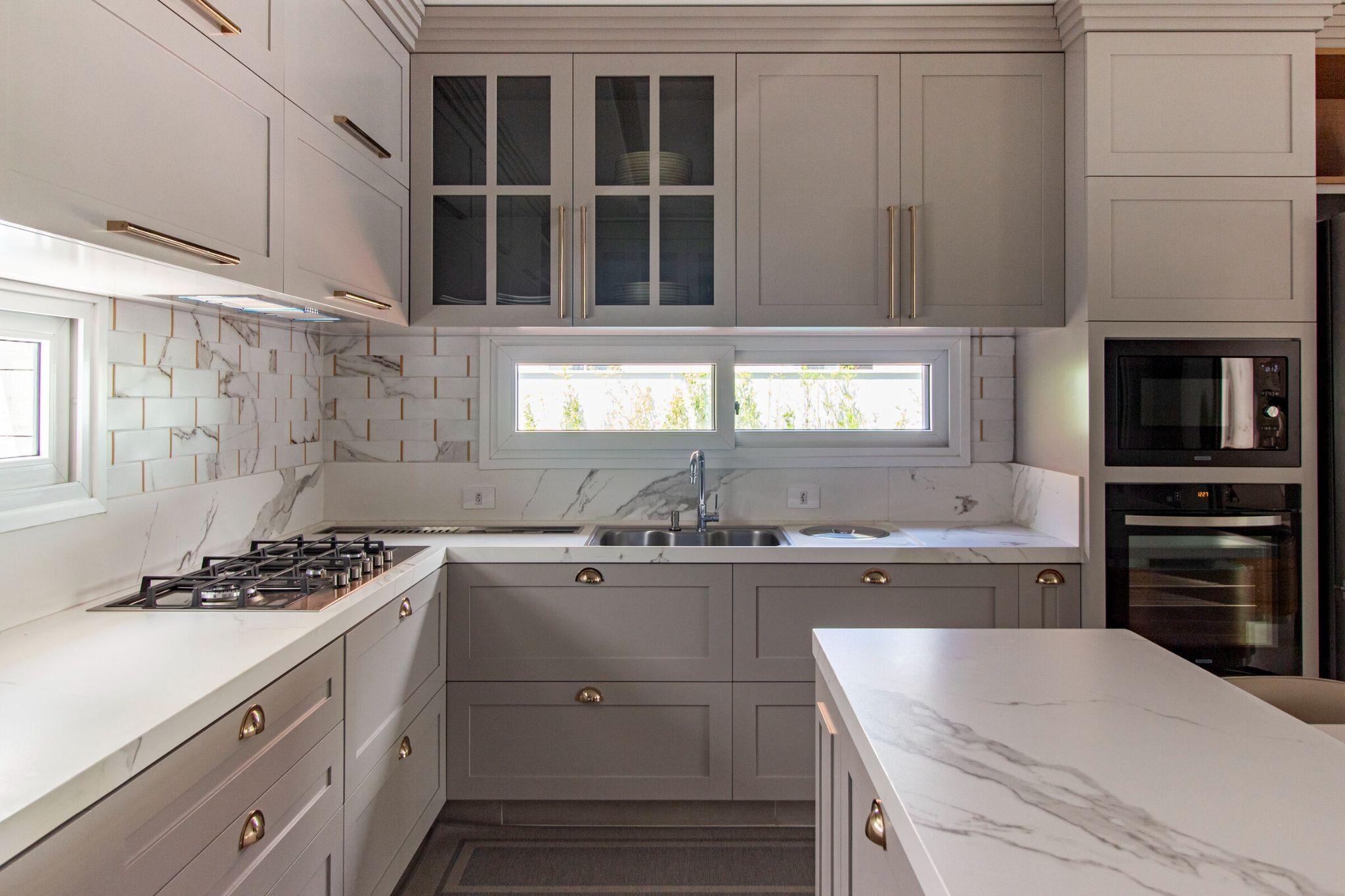 Bếp phụ theo phong cách châu Âu với tủ âm tường màu ghi và mặt đá vân mây. Ánh sáng tự nhiên từ ô cửa ngang giúp không gian luôn sáng và thoáng