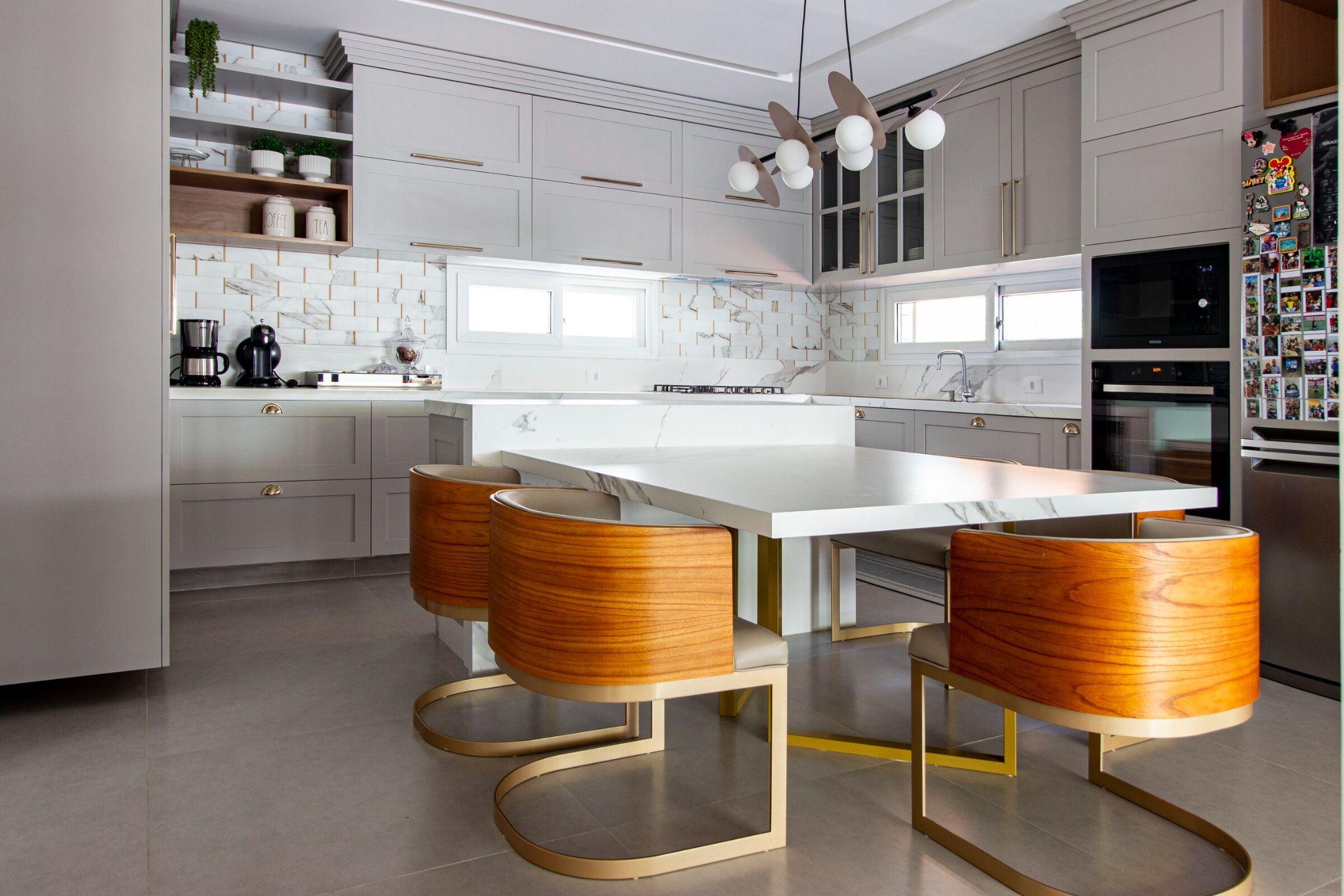 Bếp kết hợp bàn ăn trung tâm với ghế gỗ cong và chân kim loại mạ vàng. Phong cách thiết kế tối giản, đồng bộ giúp không gian vừa sang trọng vừa tiện dụng