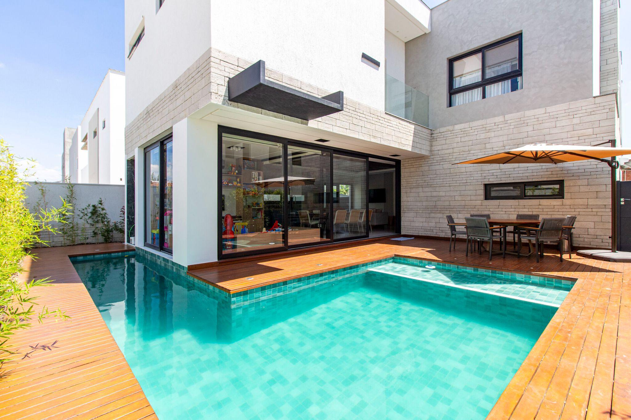 Hồ bơi ốp gạch mosaic xanh nằm liền kề phòng khách, bao quanh bằng sàn gỗ ngoài trời. Cửa kính trượt lớn giúp kết nối trong - ngoài, tạo cảm giác thư giãn như resort tại gia