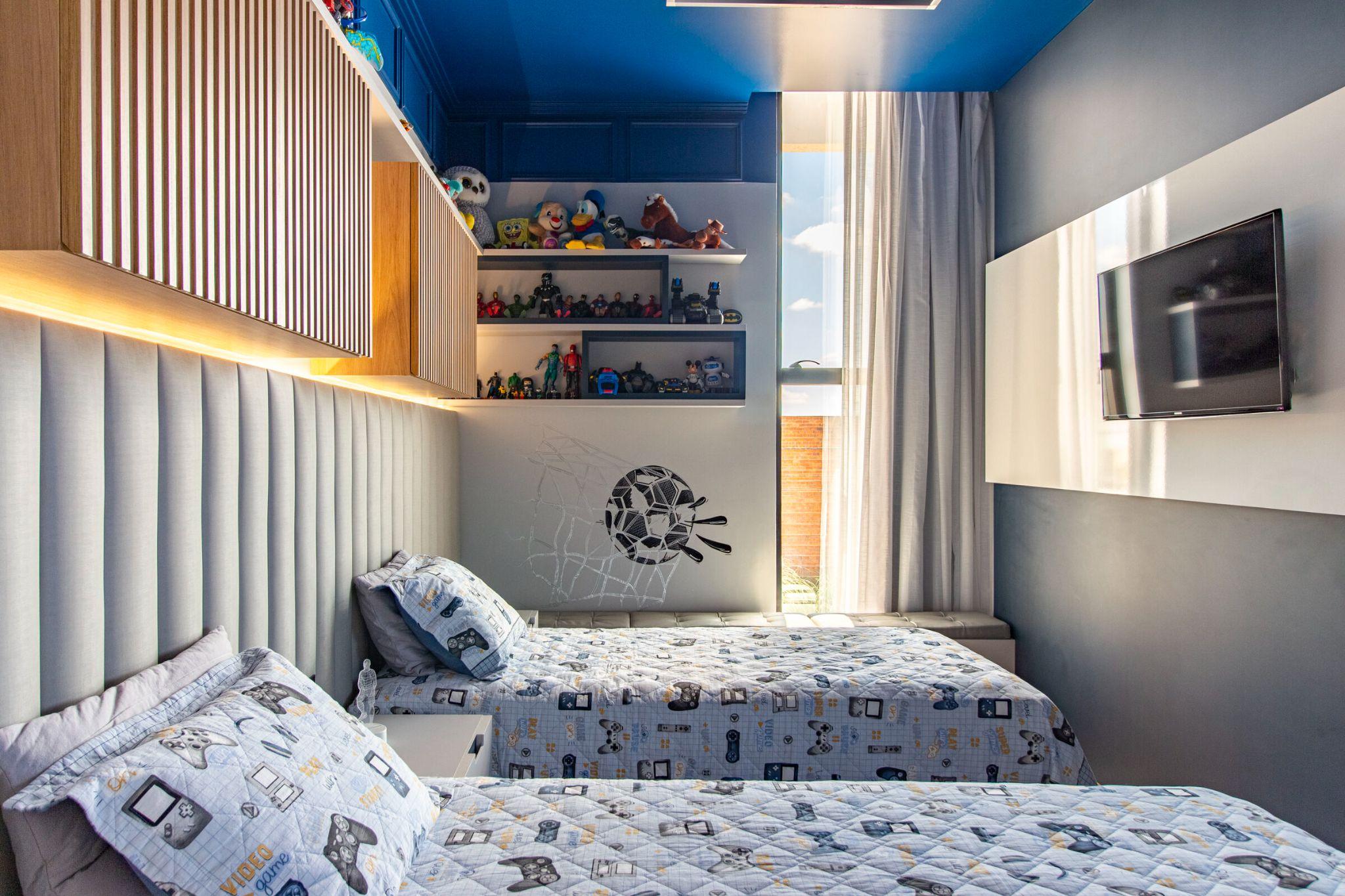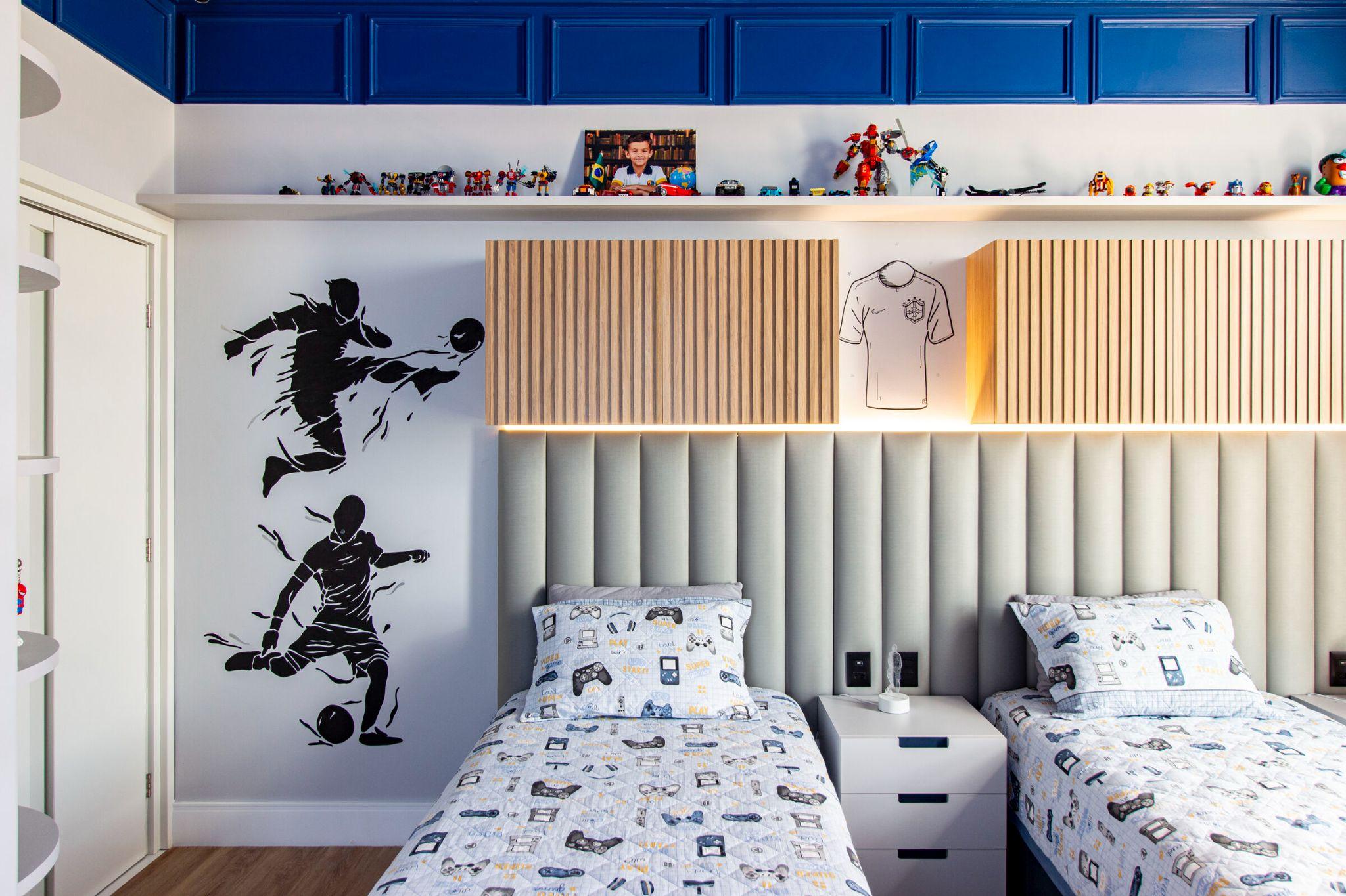 Phòng ngủ đôi dành cho bé trai với tông xanh - xám chủ đạo và hình vẽ cầu thủ trên tường. Thiết kế năng động, thể hiện sở thích thể thao và cá tính riêng của trẻ