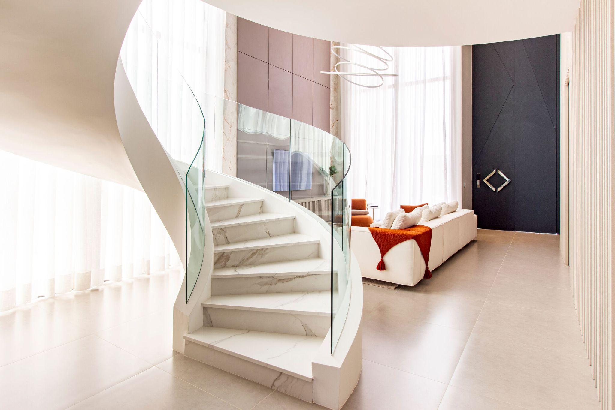Sảnh chính tràn ngập ánh sáng với cầu thang xoắn ốc bằng đá cẩm thạch trắng và lan can kính trong suốt. Thiết kế đường cong mềm mại tạo điểm nhấn nghệ thuật cho không gian