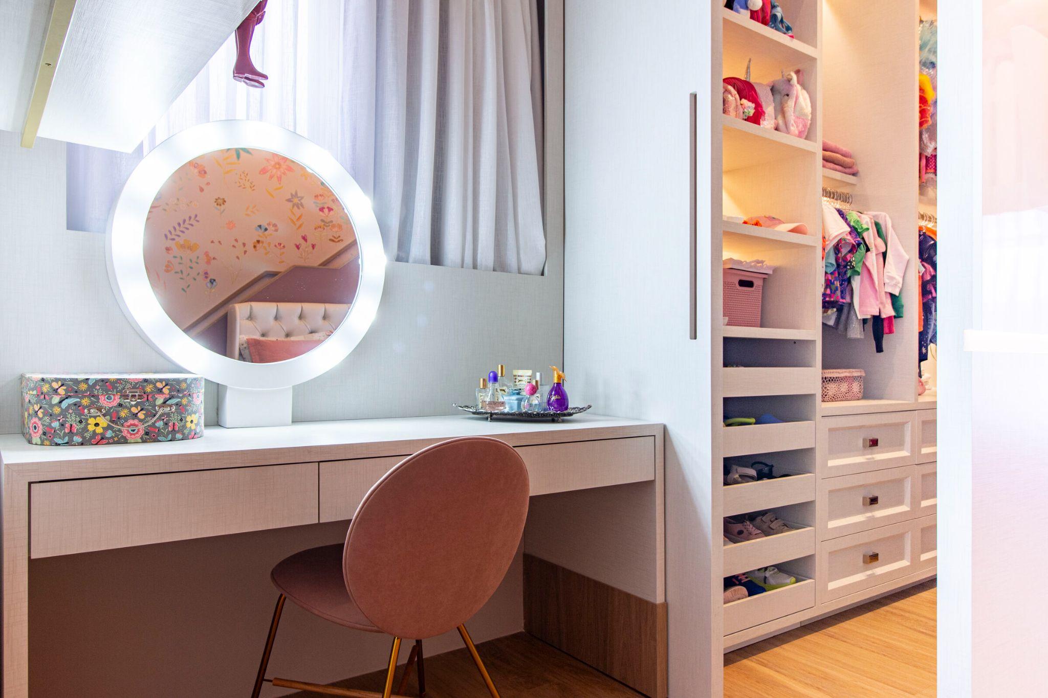 Bàn trang điểm nhỏ gọn đặt cạnh cửa sổ, đối diện khu thay đồ mở. Cách bố trí thông minh giúp căn phòng tiết kiệm diện tích nhưng vẫn đầy tiện nghi