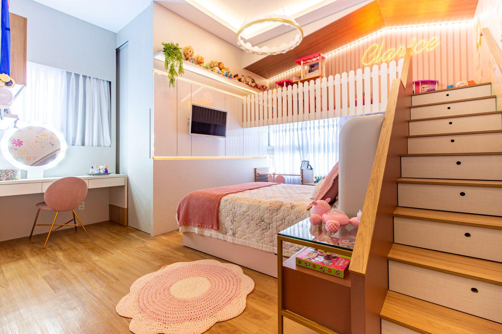 Tổng thể phòng ngủ bé gái nhìn từ lối vào, kết hợp giường, bàn học và cầu thang dẫn lên tầng lửng. Không gian được chiếu sáng tự nhiên và trang trí bằng ánh đèn LED ấm áp