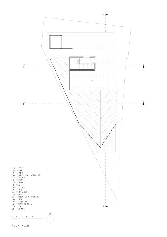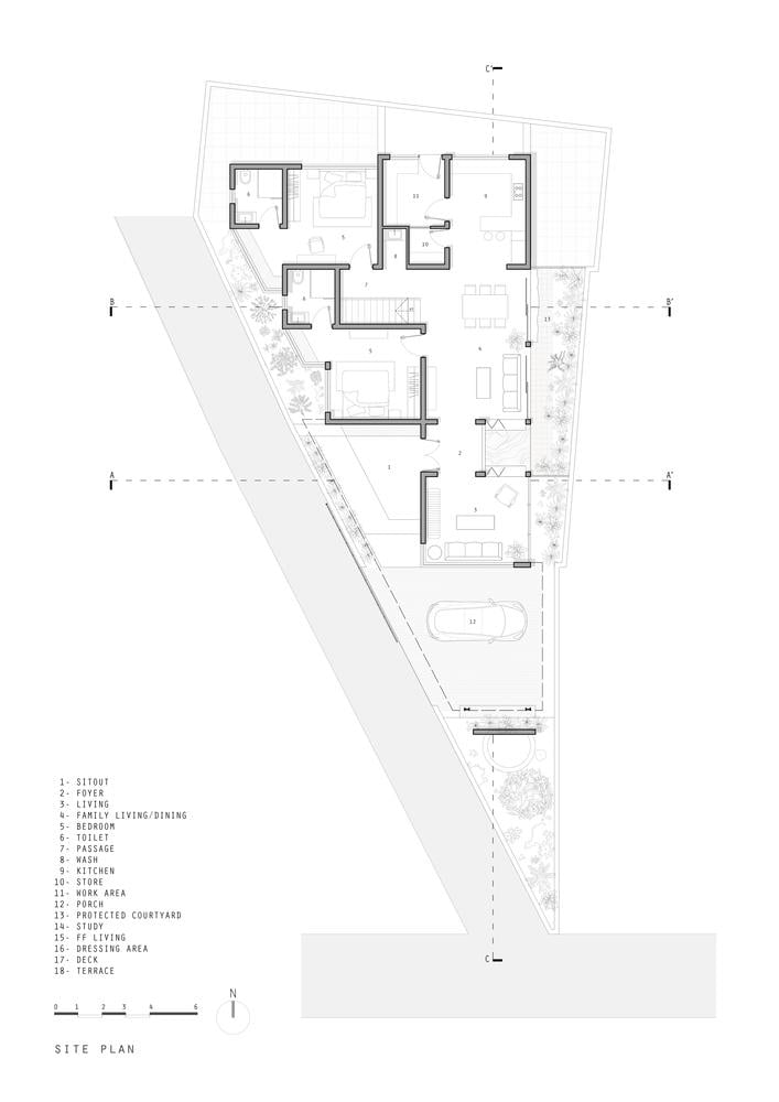 Giữa nhịp sống hối hả của bang Kerala, mảnh đất rộng khoảng 323.7 m2 nằm nép mình bên quốc lộ, chỉ cách biển chưa đầy trăm mét. Với dạng hình thang vát chéo cùng những quy định nghiêm ngặt của vùng kiểm soát ven biển khiến mảnh đất càng trở nên khó khai thác. Thế nhưng, thay vì e ngại, các kiến trúc sư đã chọn giải pháp để kiến trúc nương tựa vào chính sự khiếm khuyết của địa hình.