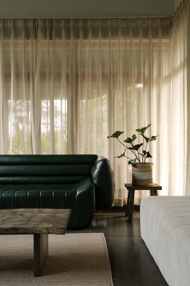 Những lớp rèm lụa mềm mại điều tiết ánh sáng, tạo nên một bầu không khí dịu dàng cho phòng khách