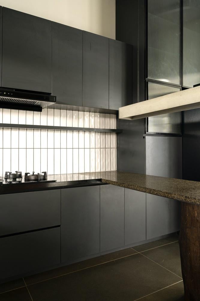 Khu vực bếp hiện đại với tông màu tối huyền bí và hệ gạch thẻ ốp tường bắt sáng