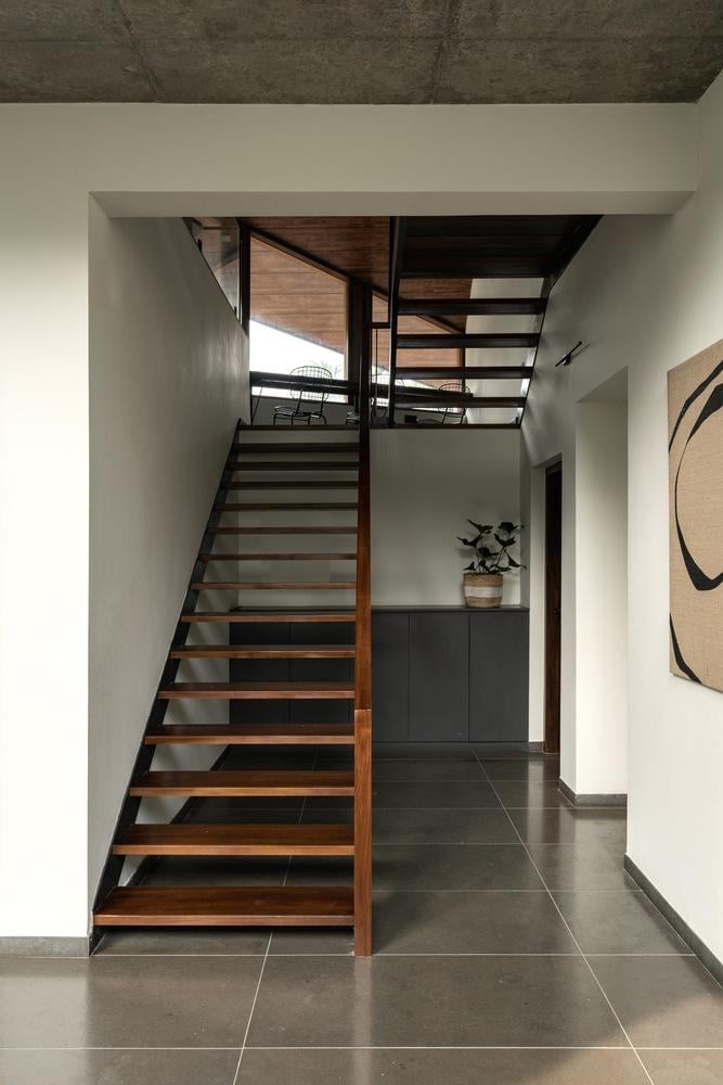 Hệ cầu thang gỗ với kết cấu thanh thoát, đóng vai trò như một điểm nhấn điêu khắc