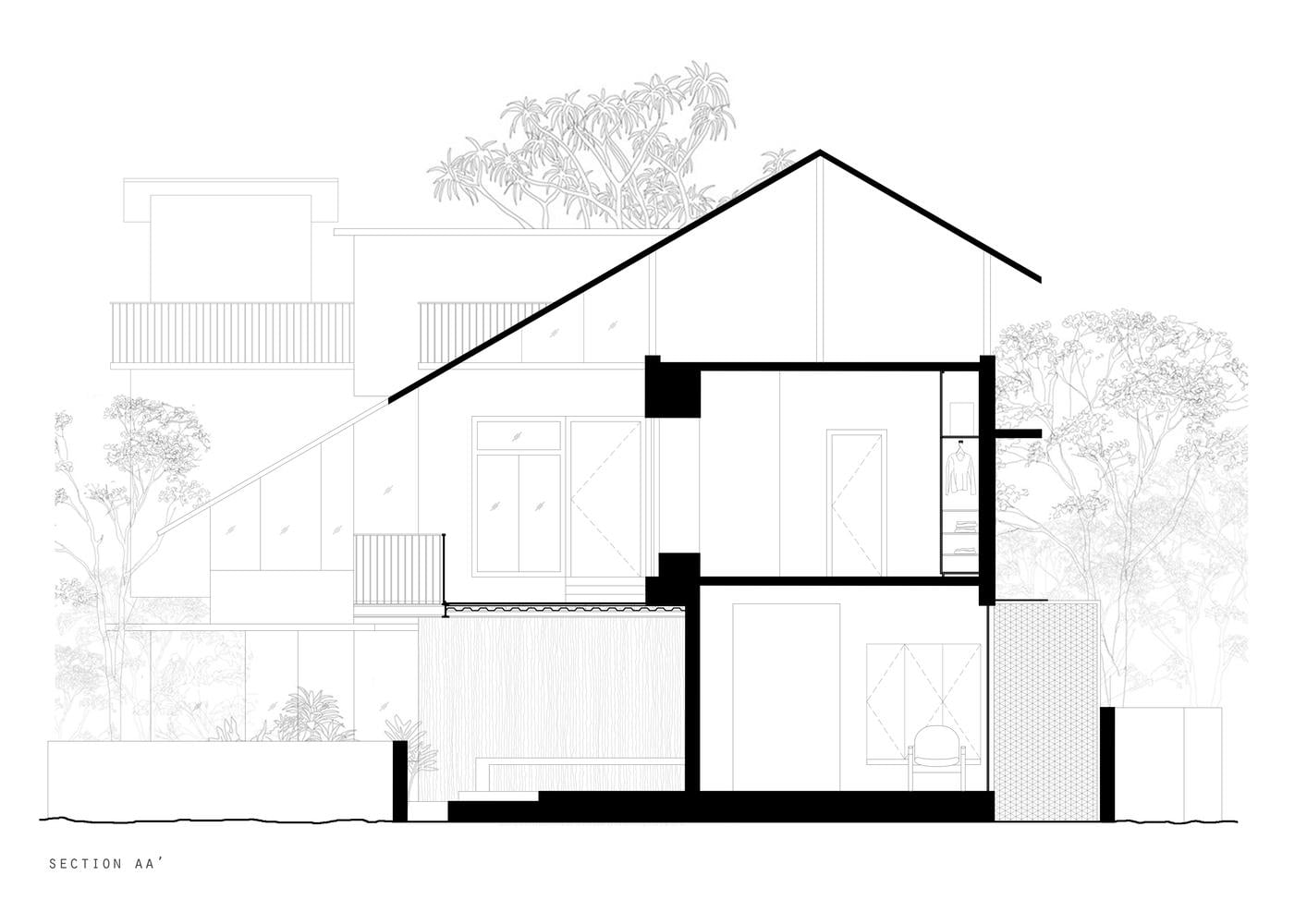 Thay vì cố gò ép công trình vào một cái khuôn vuông vức truyền thống, họ chọn cách để kiến trúc mọc lên từ chính hình dáng nguyên bản của đất. Góc nhọn nhất của mảnh đất không còn là phế tích, mà trở thành một khoảng vườn tam giác xanh mướt, nơi thiên nhiên và kiến trúc bắt đầu cuộc đối thoại tĩnh lặng của mình.