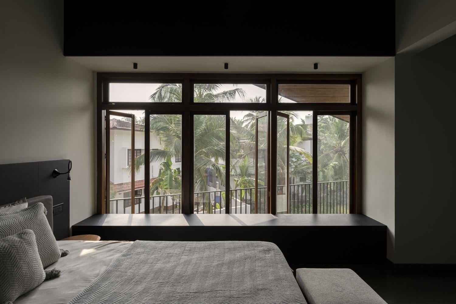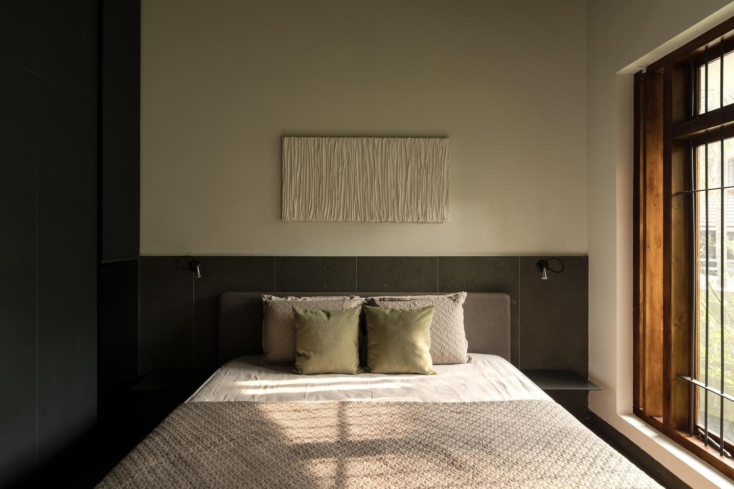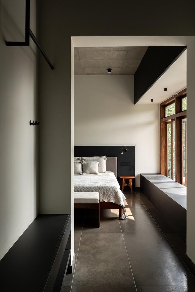 Phòng ngủ chính mang đậm tinh thần tối giản với hướng nhìn mở rộng ra khu vườn