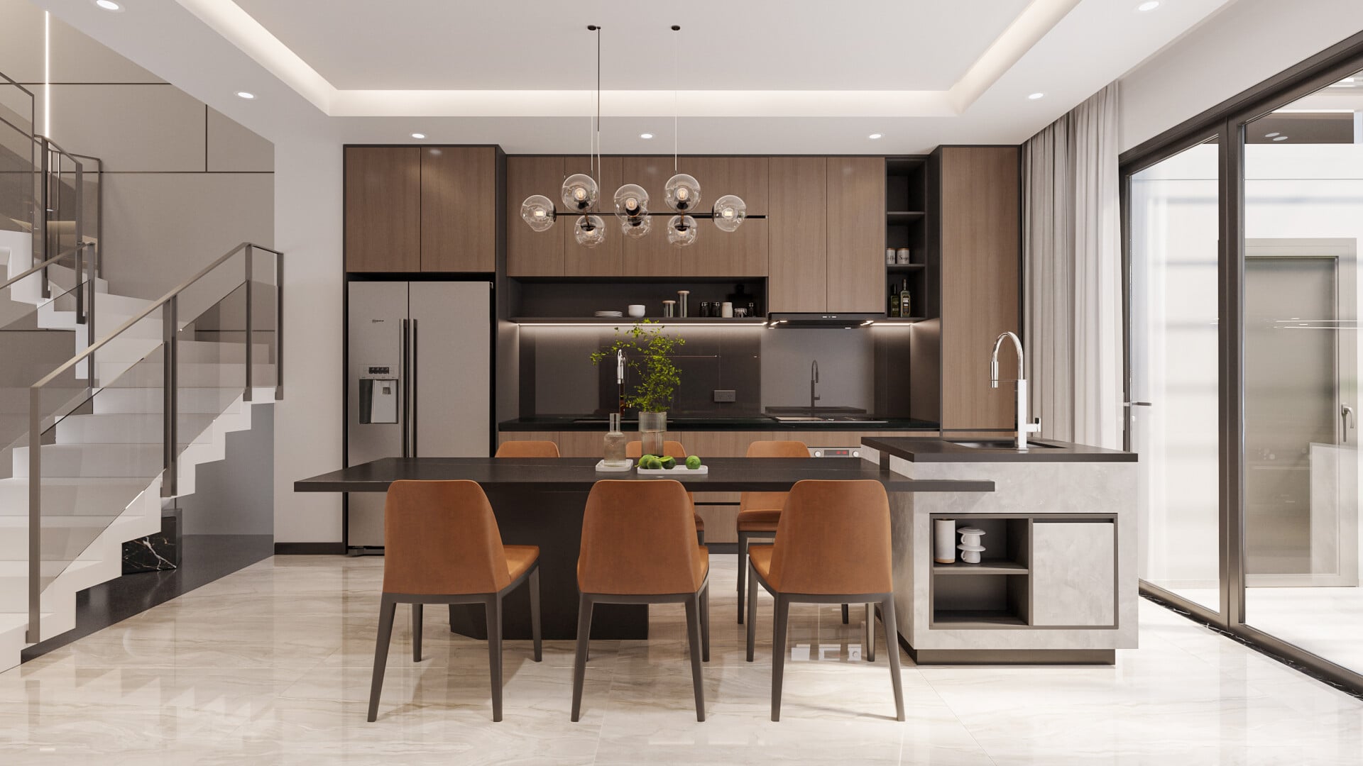 • Tầng trệt (Tầng 1): Dành nhiều không gian cho sinh hoạt chung với sân trước thoáng đãng, phòng khách hiện đại và đặc biệt là một phòng chơi trẻ em riêng biệt nằm cạnh khu bếp, giúp bố mẹ vừa nấu nướng vừa dễ dàng quan sát con nhỏ.