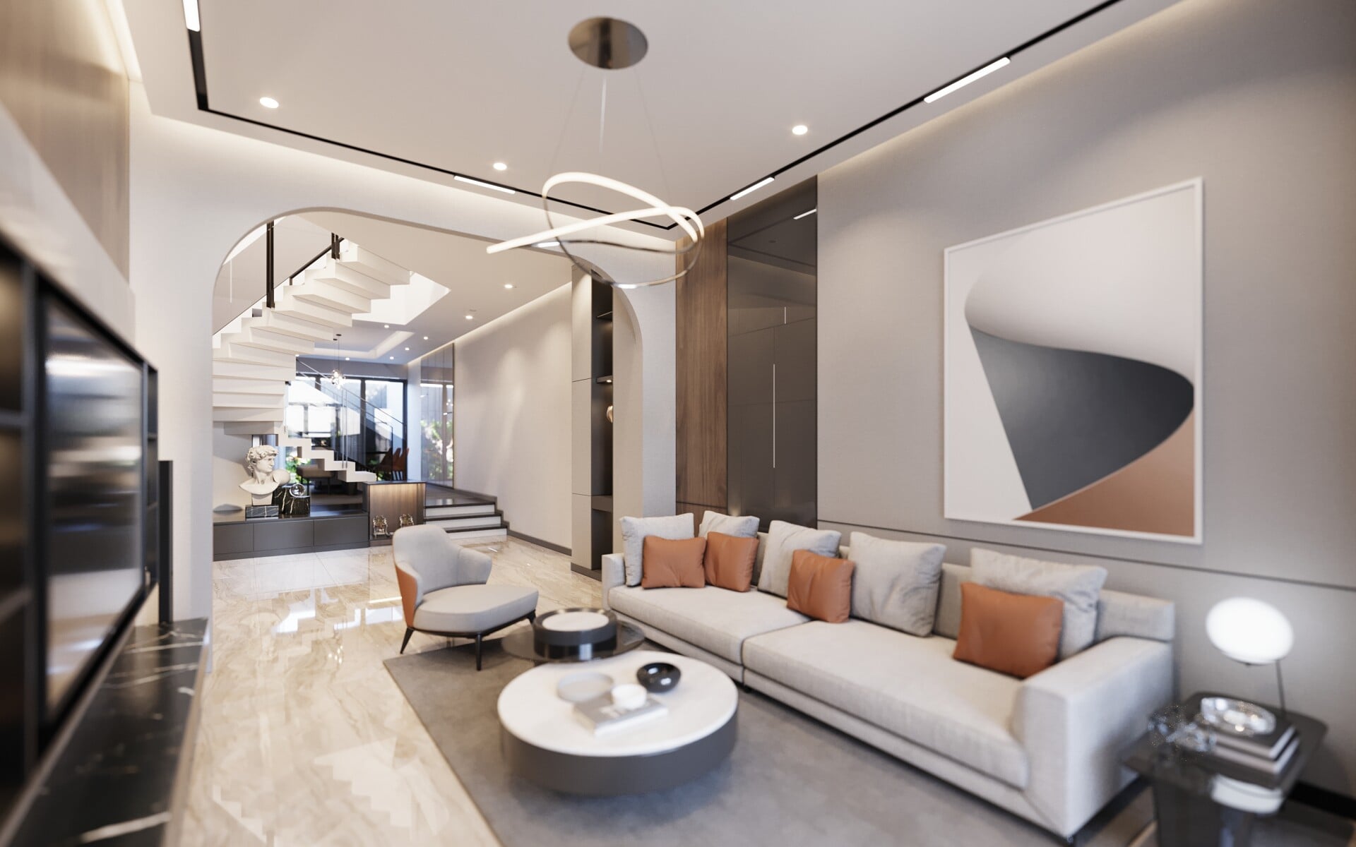 Bước vào Sinh House, cảm giác đầu tiên là sự thư thái và thanh lịch. Toàn bộ nội thất được bao phủ bởi những gam màu trung tính như trắng, be phối hợp hoàn hảo với nâu trầm của gỗ Walnut. Sự kết hợp này không chỉ tạo chiều sâu cho không gian mà còn mang đến vẻ đẹp bền vững, không bao giờ lỗi mốt.