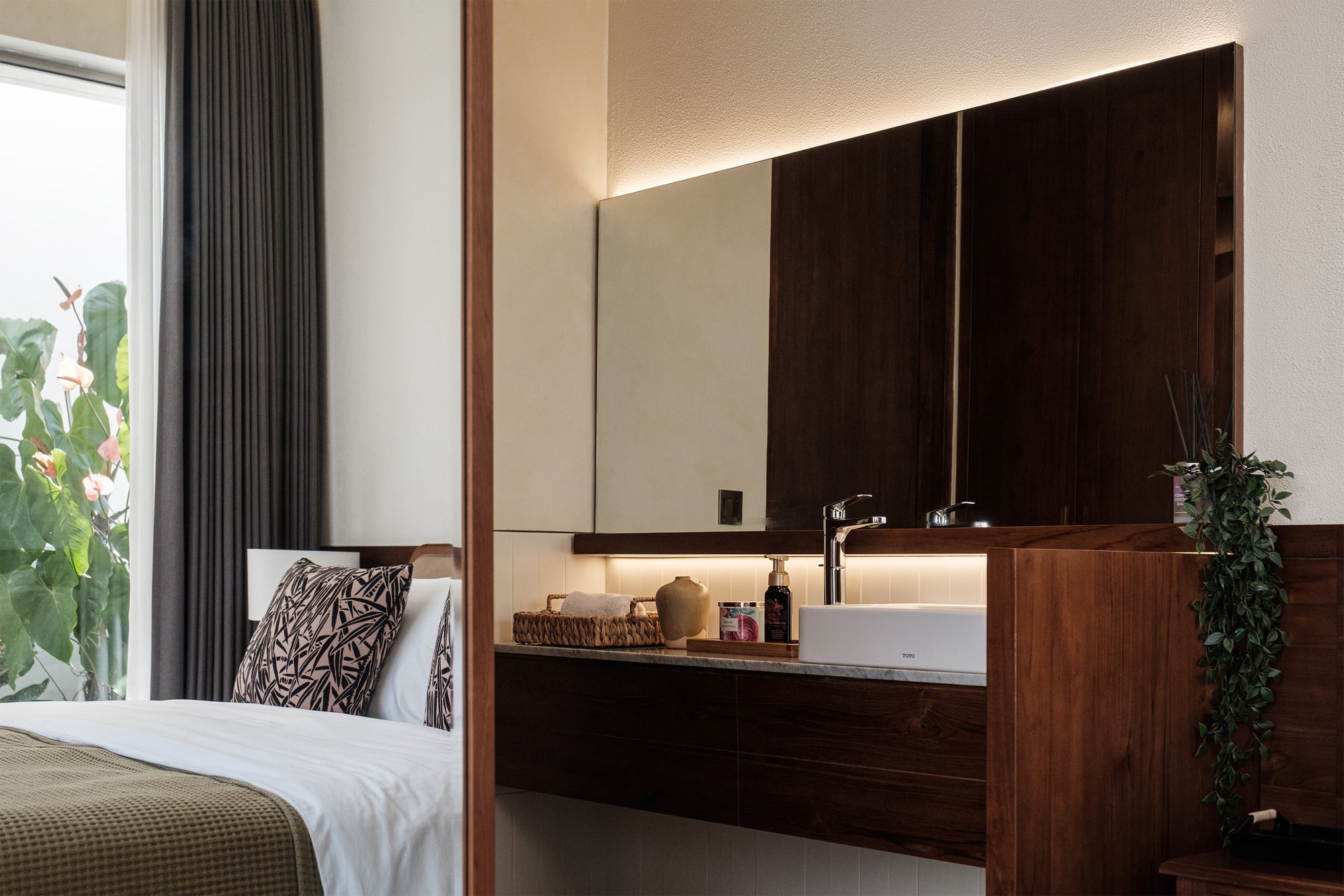 Góc phòng ngủ kết hợp khu vệ sinh với vật liệu gỗ tối màu và ánh sáng gián tiếp. Thiết kế tạo cảm giác ấm cúng, yên tĩnh cho không gian nghỉ ngơi