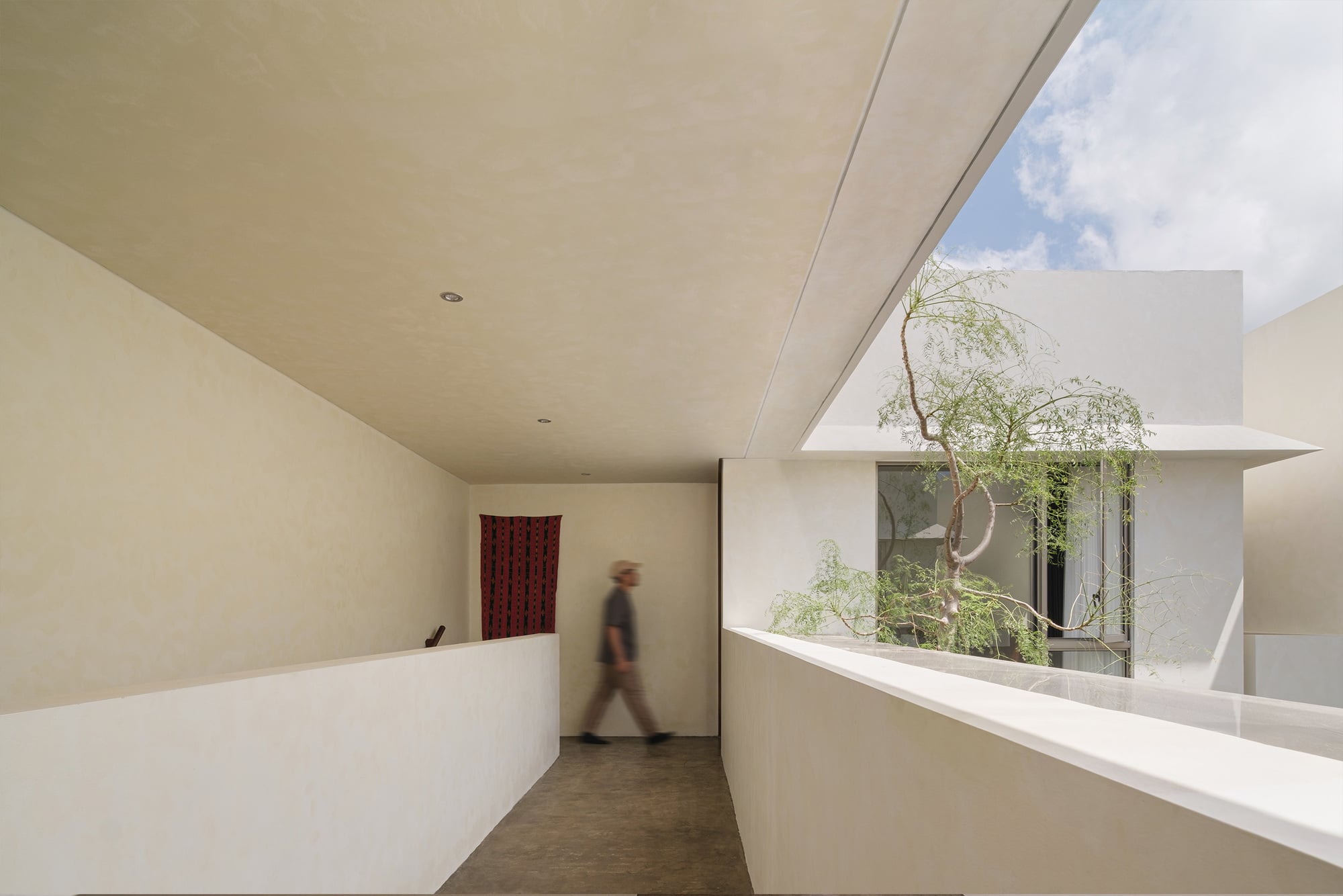 Hành lang tầng trên nhìn về sân trong, nơi cây xanh trở thành điểm nhấn thị giác chính. Thiết kế này giúp các không gian riêng tư vẫn giữ kết nối với thiên nhiên
