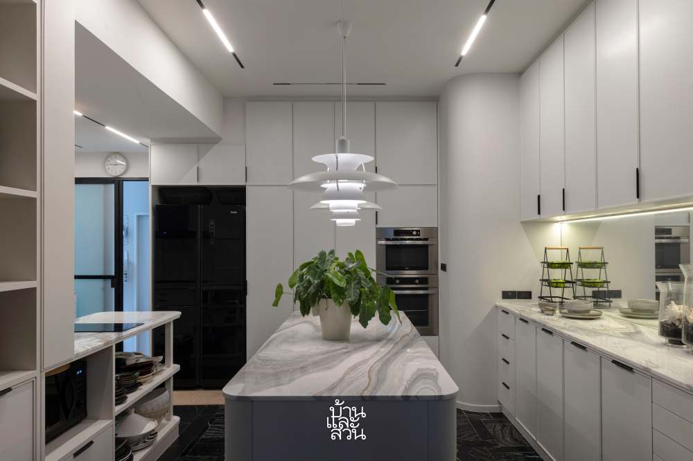 Bếp chính sử dụng tông trắng chủ đạo với hệ tủ cao sát trần để tăng khả năng lưu trữ. Đảo bếp ốp đá marble sáng màu đóng vai trò trung tâm cho các hoạt động chuẩn bị và sinh hoạt hằng ngày