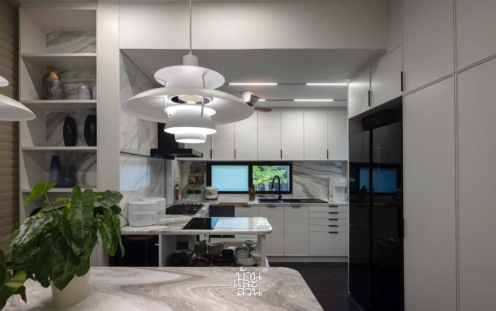 Bếp chính được thiết kế với tông trắng sáng để tạo cảm giác sạch sẽ và dễ sử dụng. Hệ tủ được bố trí chạy dọc theo tường, đủ chỗ cho rất nhiều đồ bếp vốn đã có sẵn từ trước. Ở giữa là đảo bếp ốp đá marble trắng, vừa dùng để chuẩn bị đồ ăn, vừa là điểm tụ họp nhẹ nhàng trong lúc nấu nướng.