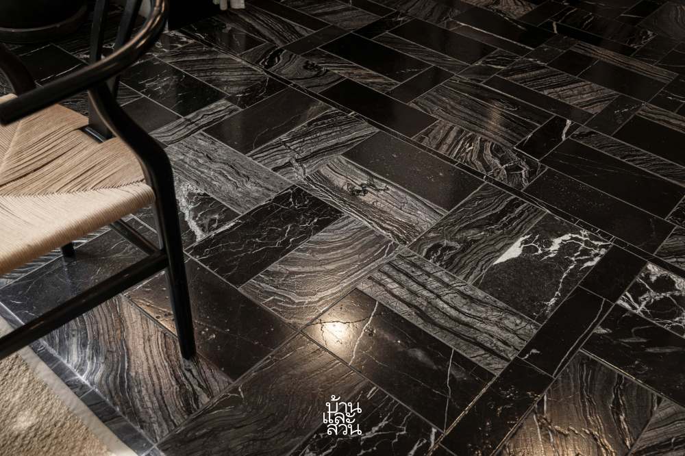 Chi tiết sàn đá marble đen mài mờ được lát ngẫu nhiên, không ghép vân theo khuôn mẫu. Vật liệu này giúp giảm độ chói, tạo cảm giác mát và kiểm soát tốt cảm xúc không gian trong toàn bộ ngôi nhà