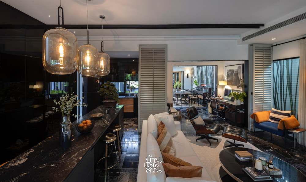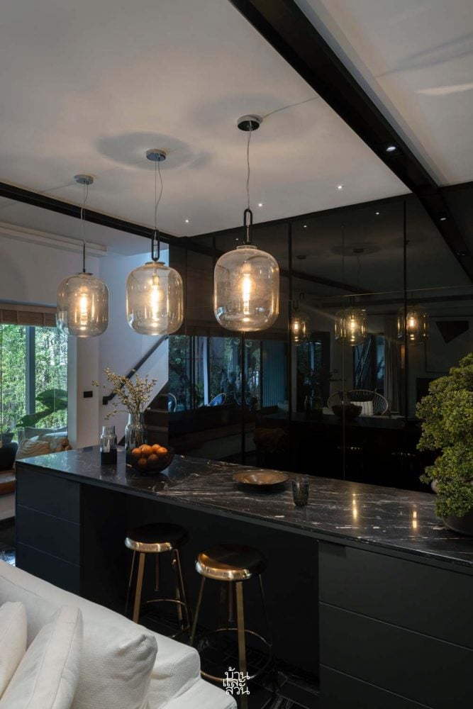 Khu bếp mở với đảo bếp màu đen làm điểm nhấn, kết hợp đèn thả tạo ánh sáng ấm cho sinh hoạt buổi tối. Hệ tủ bếp sử dụng kính phủ film đen giúp che đồ nhưng vẫn tạo chiều sâu thị giác