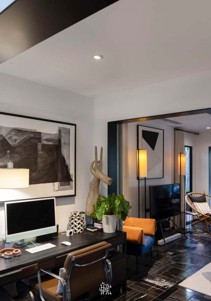 Một góc làm việc nhỏ được bố trí ngay trong không gian sinh hoạt chung, tận dụng ánh sáng tự nhiên từ cửa kính. Nội thất gọn gàng giúp khu vực này không phá vỡ cảm giác liền mạch của tổng thể ngôi nhà