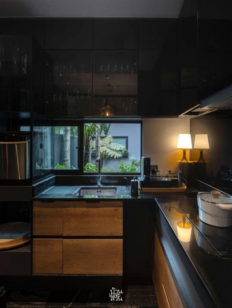 Góc bếp được thiết kế gọn gàng với cửa sổ nhỏ nhìn ra vườn trong, mang ánh sáng và gió tự nhiên vào khu vực nấu nướng. Sự kết hợp giữa tủ đen và ngăn kéo gỗ giúp không gian bếp bớt nặng nề, dễ sử dụng hằng ngày
