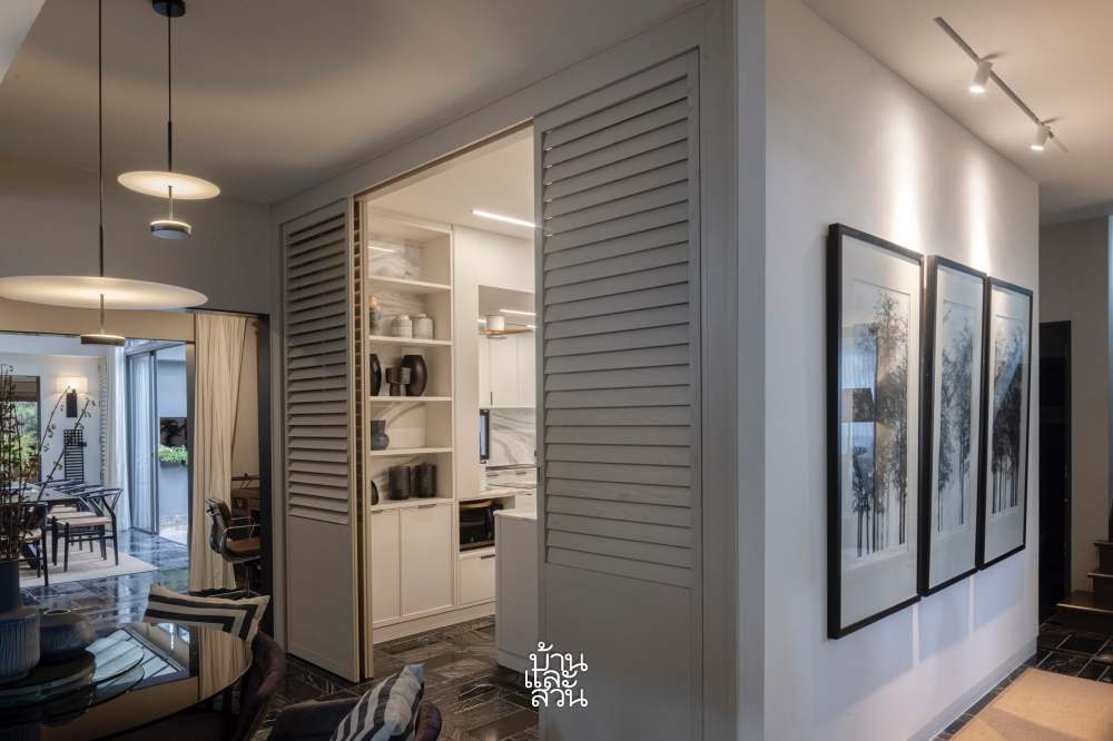 Khu bếp phụ được đặt sau hệ cửa chớp trượt, có thể đóng lại khi không sử dụng. Giải pháp này giúp che bớt khu vực kỹ thuật, giữ cho không gian sinh hoạt luôn gọn gàng và thoáng mắt