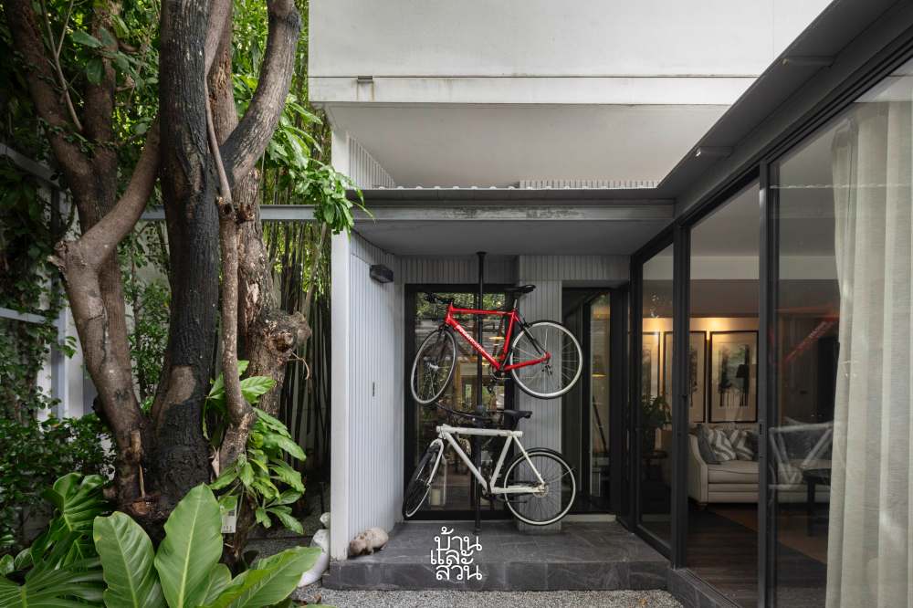 Khoảng sân nhỏ bên hông nhà được tận dụng làm nơi để xe đạp và lối chuyển tiếp vào không gian trong nhà. Cây xanh lớn được giữ lại giúp che nắng, tạo bóng mát và cảm giác gần gũi với thiên nhiên ngay từ lối vào