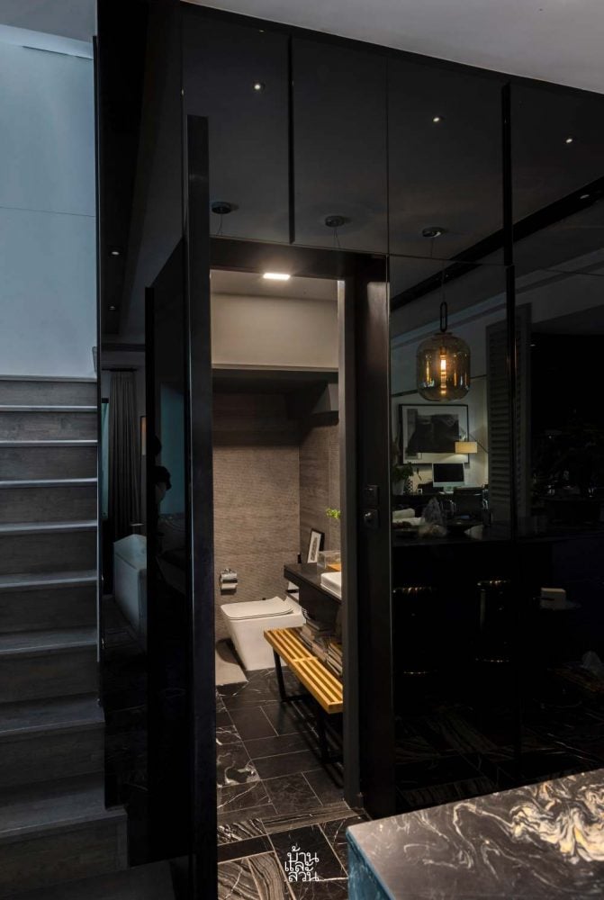 Phòng tắm được giấu khéo léo sau hệ tủ tối màu, khi đóng lại gần như hòa vào không gian chung. Đây là giải pháp giúp giữ sự liền mạch về thị giác và tăng tính gọn gàng cho tầng sinh hoạt