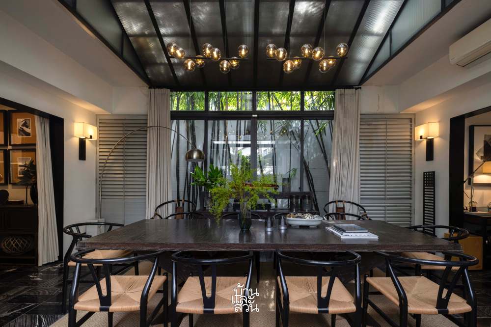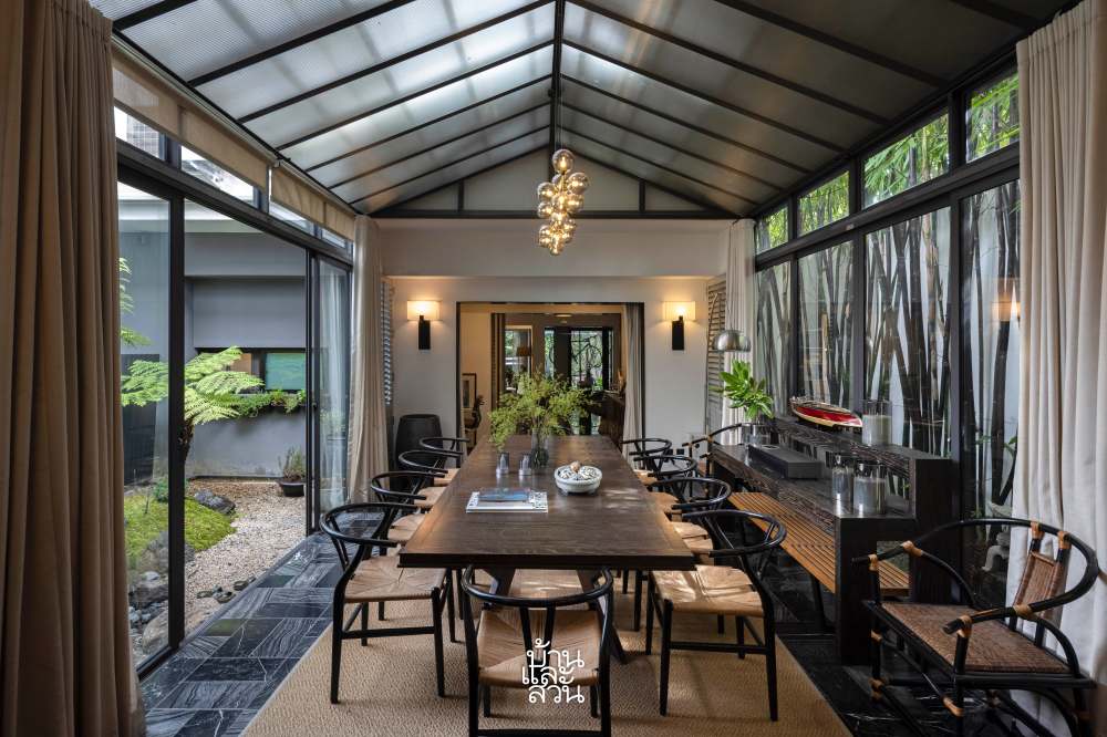 Ban đầu, không gian này được sử dụng như một phòng khách chung - nơi cả gia đình có thể ngồi thư giãn, nhìn ra khu vườn nhỏ bên trong. Nhưng khi nhu cầu sinh hoạt thay đổi, gia chủ dễ dàng chuyển công năng thành phòng ăn lớn, đặt một chiếc bàn dài ở giữa để cả nhà quây quần mỗi ngày. Việc thay đổi này không cần đập phá hay sửa chữa phức tạp, bởi ngay từ đầu, không gian đã được thiết kế mở và linh hoạt.