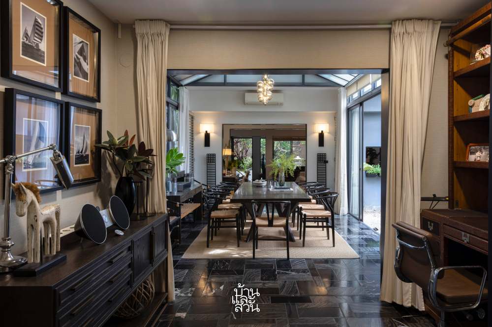 Phòng ăn trung tâm đóng vai trò là trục kết nối giữa hai căn nhà, với sàn đá marble tối màu giúp giảm độ chói ánh sáng. Cách bố trí mở cho phép không gian này vừa là nơi ăn uống, vừa là điểm sinh hoạt chung của gia đình