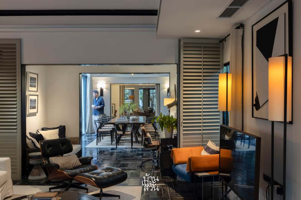 Phòng khách chính sử dụng bảng màu trắng - đen - gỗ để tạo cảm giác sáng nhưng không bị chói. Cửa kính lớn mở ra khu vườn bên hông giúp tăng thông gió tự nhiên và mở rộng tầm nhìn