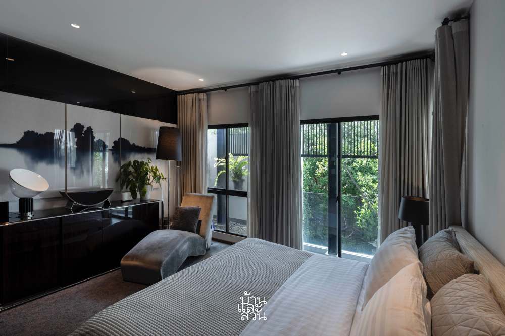 Phòng ngủ được thiết kế với gam màu trầm, ít chi tiết để tạo cảm giác thư giãn. Cuối giường là vách kính phủ film đen, kết hợp tủ tối màu và tranh nghệ thuật khổ lớn. Ban ngày, rèm có thể mở để đón nắng sớm, giúp phòng khô thoáng và dễ chịu hơn.