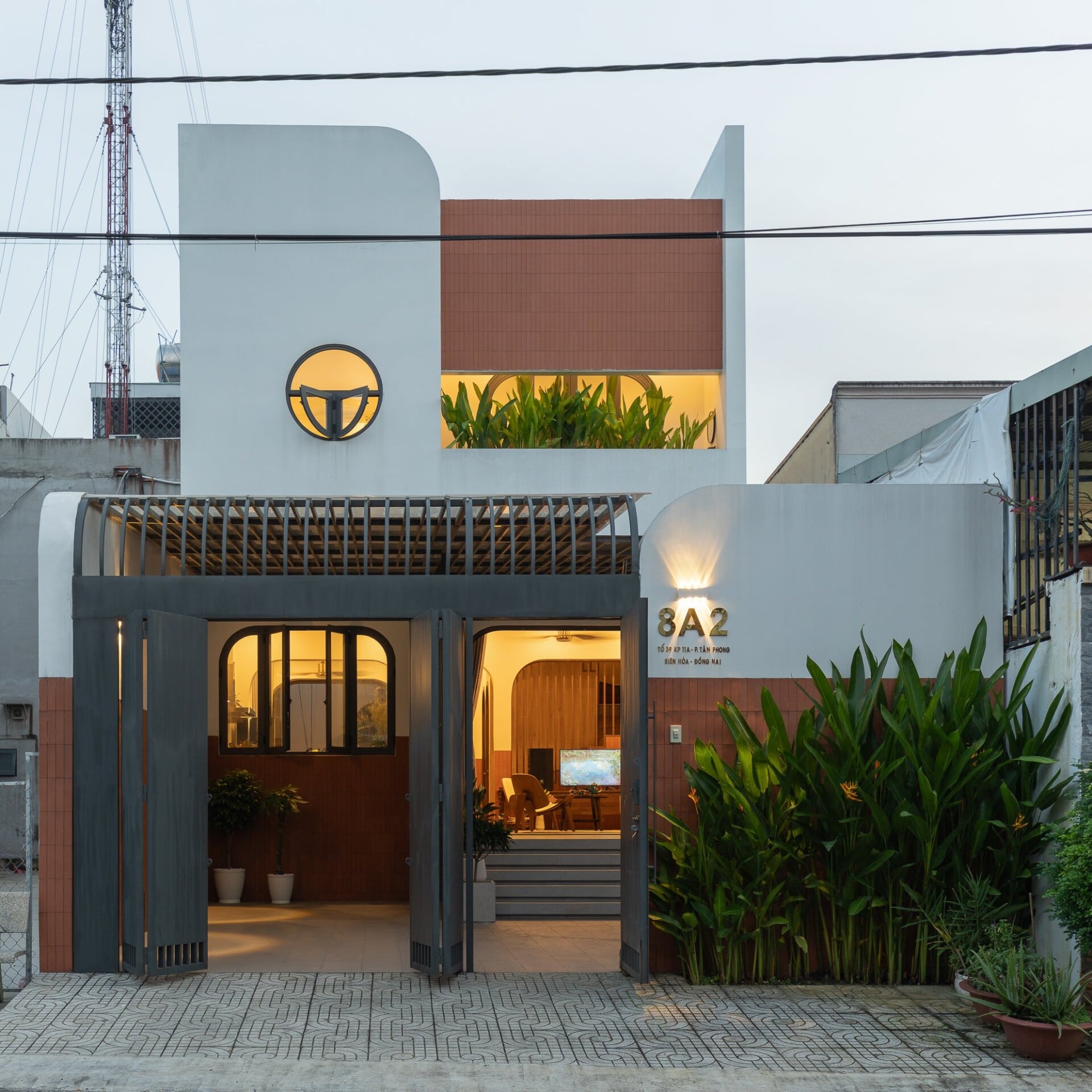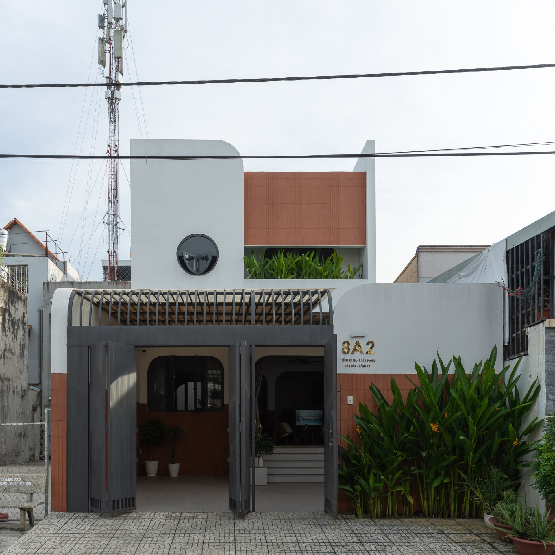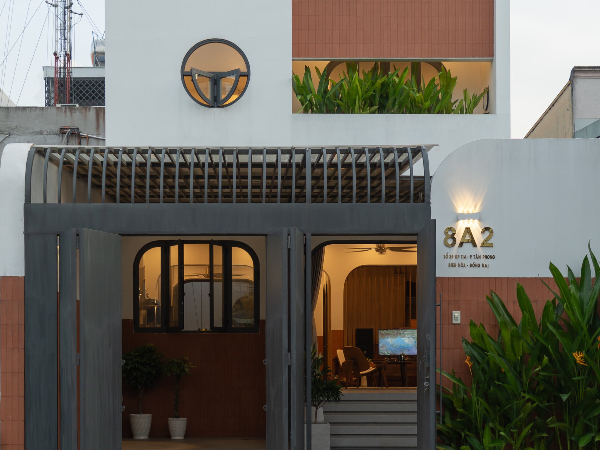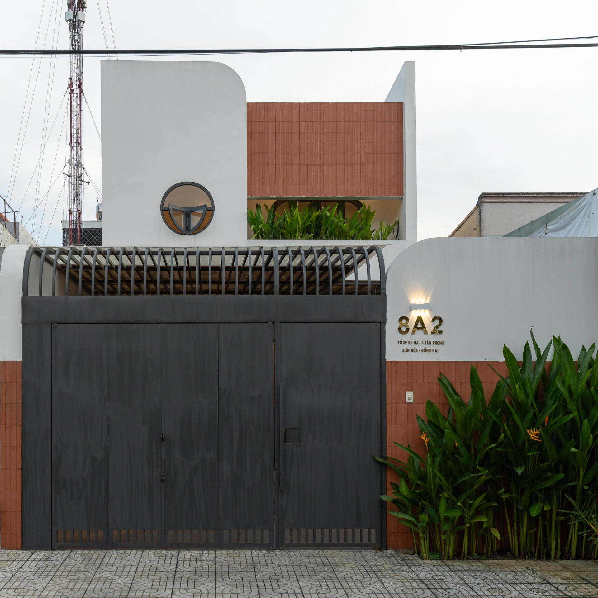 Mặt tiền nhà 8A2 với cổng sắt màu xám, mảng cong trắng và gạch thẻ đỏ tạo nhận diện riêng. Hàng cây chuối cảnh làm mềm không gian và tăng độ riêng tư.