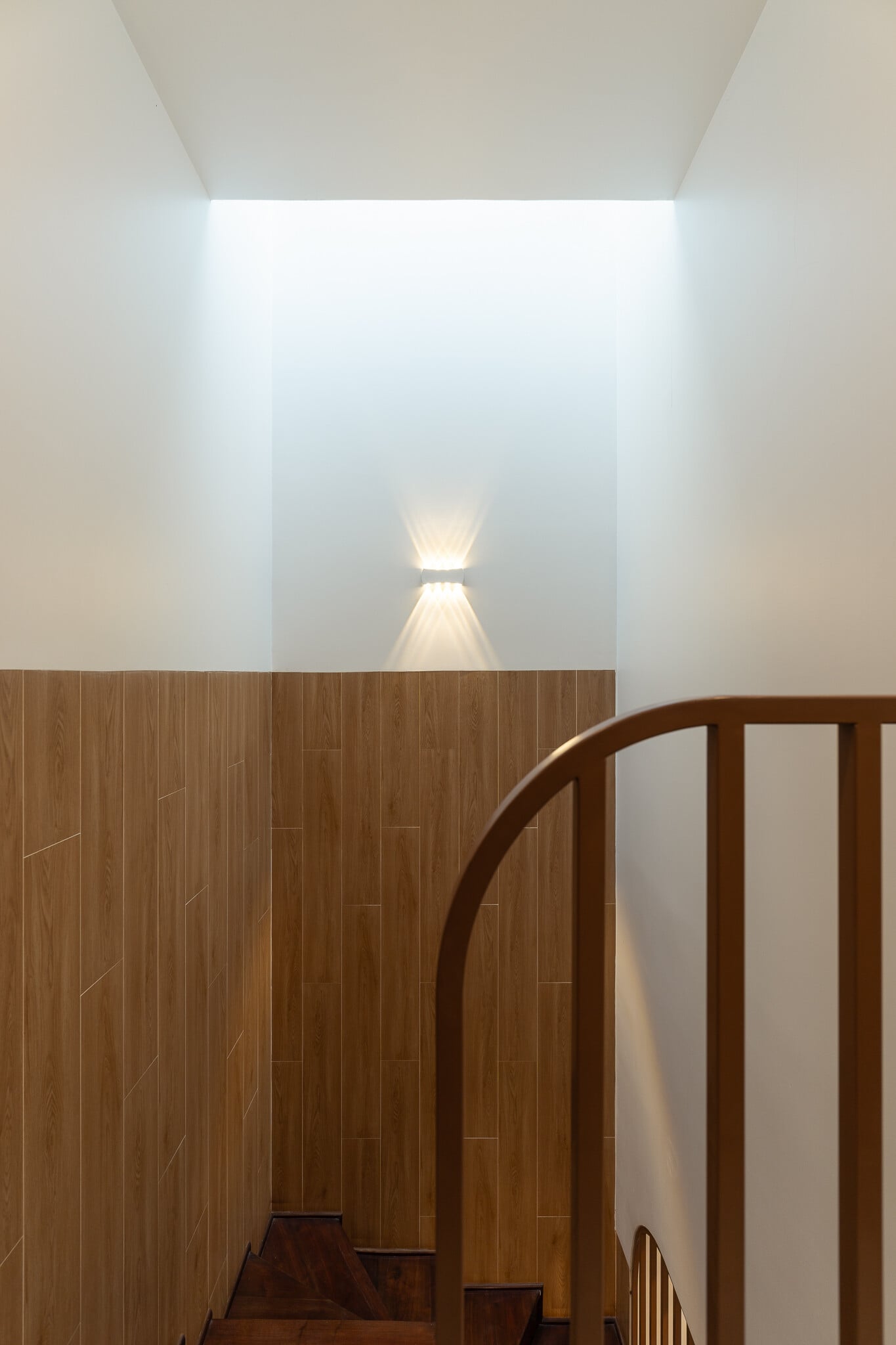 Khu vực chiếu nghỉ cầu thang nhận ánh sáng tự nhiên từ ô lấy sáng trên cao. Gạch giả gỗ được sử dụng để kiểm soát chi phí thi công.