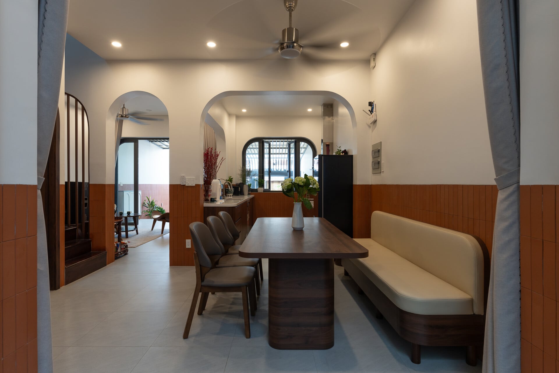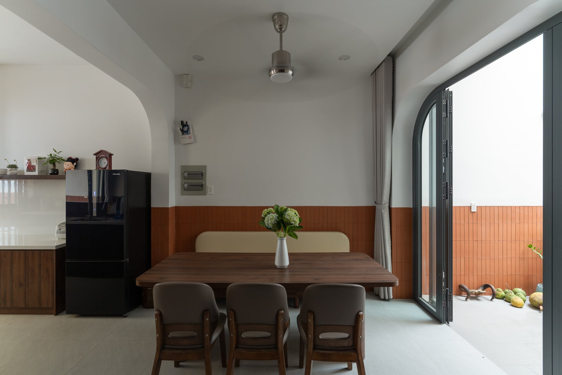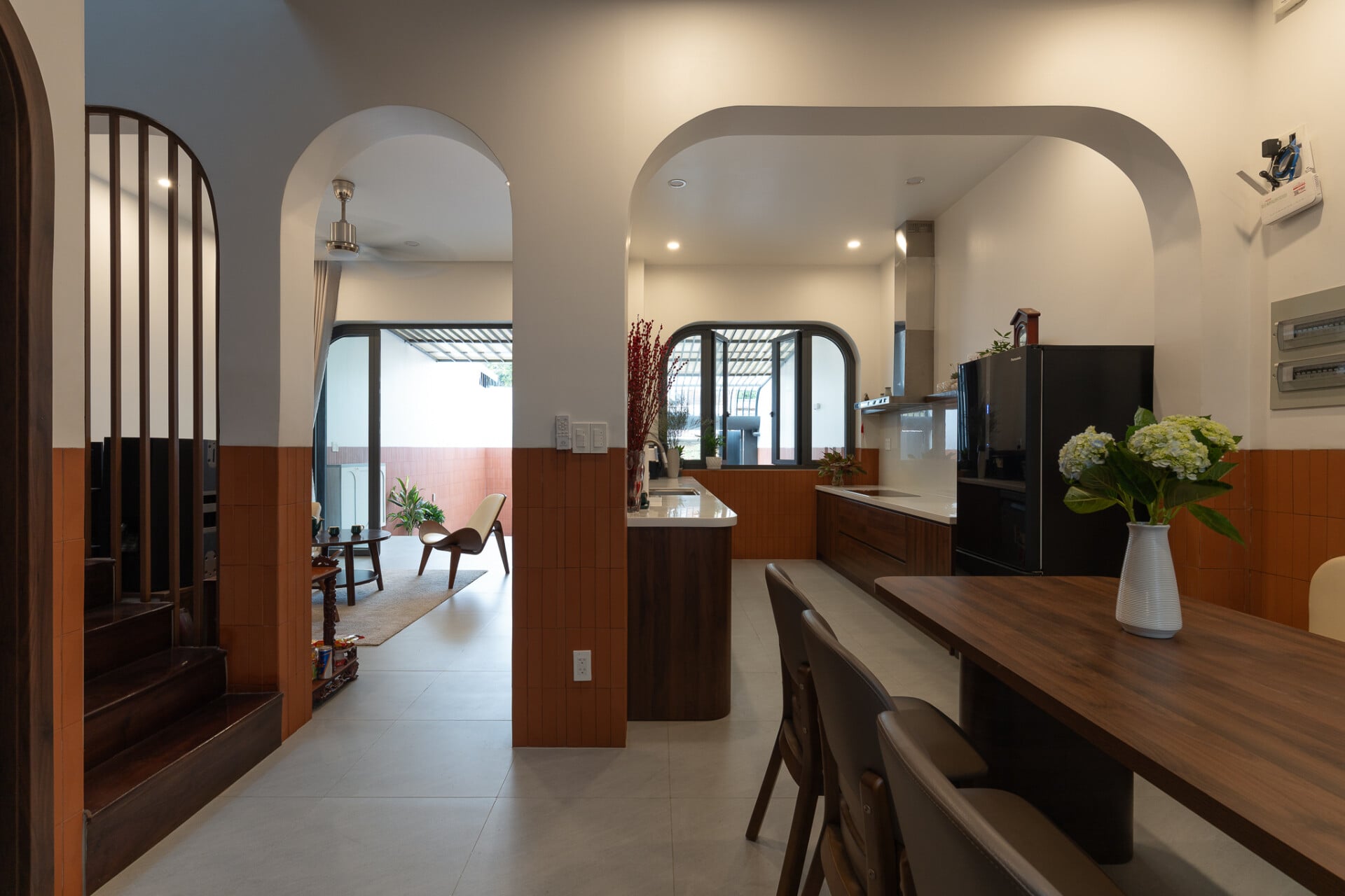 Góc nhìn từ bàn ăn nối ra phòng khách và sân trước, thể hiện sự liên thông không gian. Các vòm cong lặp lại như điểm nhận diện chủ đạo của căn nhà.