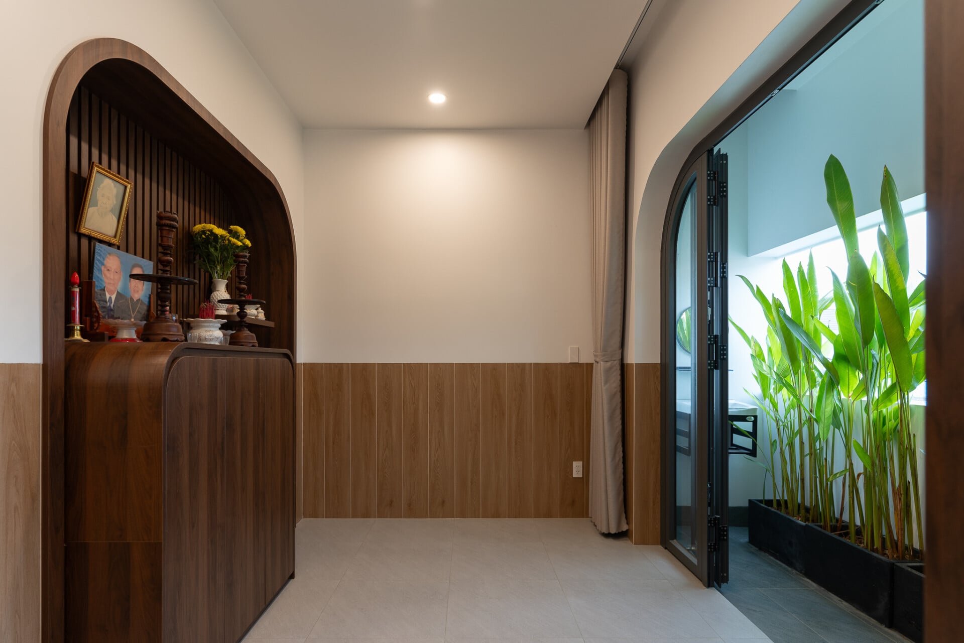 Phòng thờ với hệ tủ gỗ bo cong và mảng ốp đồng bộ. Cửa mở ra logia trồng cây để tạo độ thoáng và sự cân bằng cho không gian này.