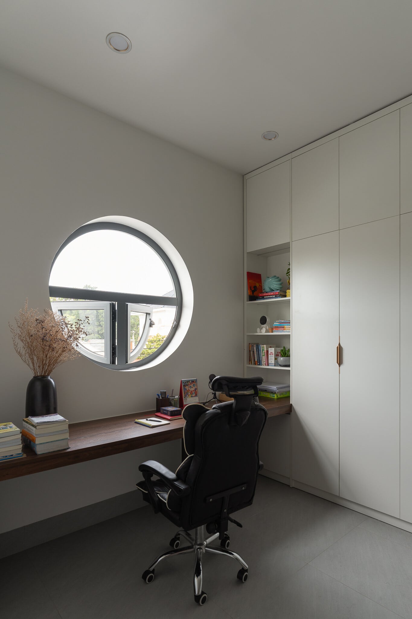 Phòng làm việc với cửa sổ tròn đặc trưng – chi tiết lặp lại từ mặt đứng. Góc bàn được bố trí đơn giản, phù hợp nhu cầu sử dụng của chủ nhà.