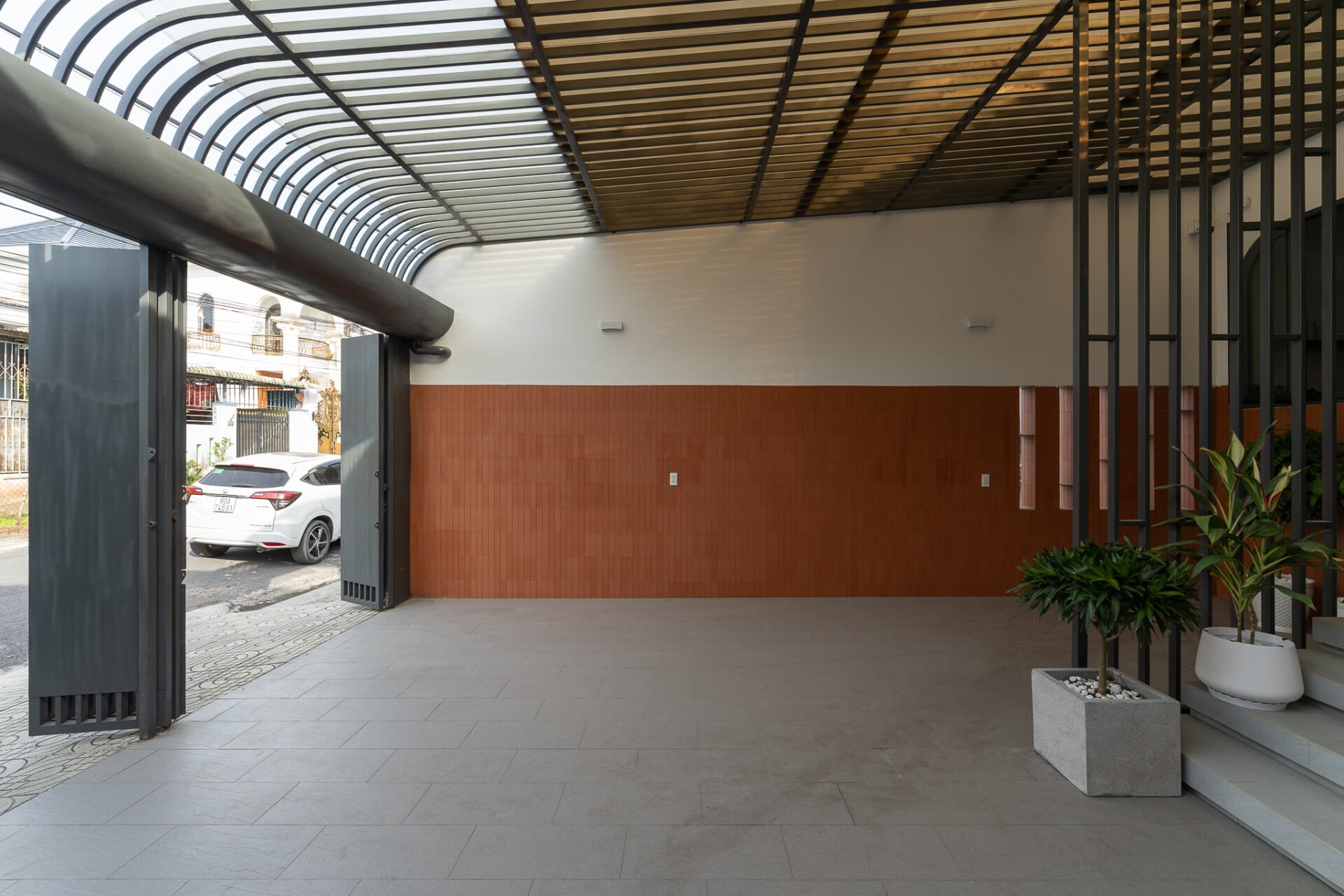 Hệ mái thép và polycarbonate lấy sáng tự nhiên cho khu vực sân xe. Thiết kế giữ được sự kín đáo nhưng không gây bí bách.