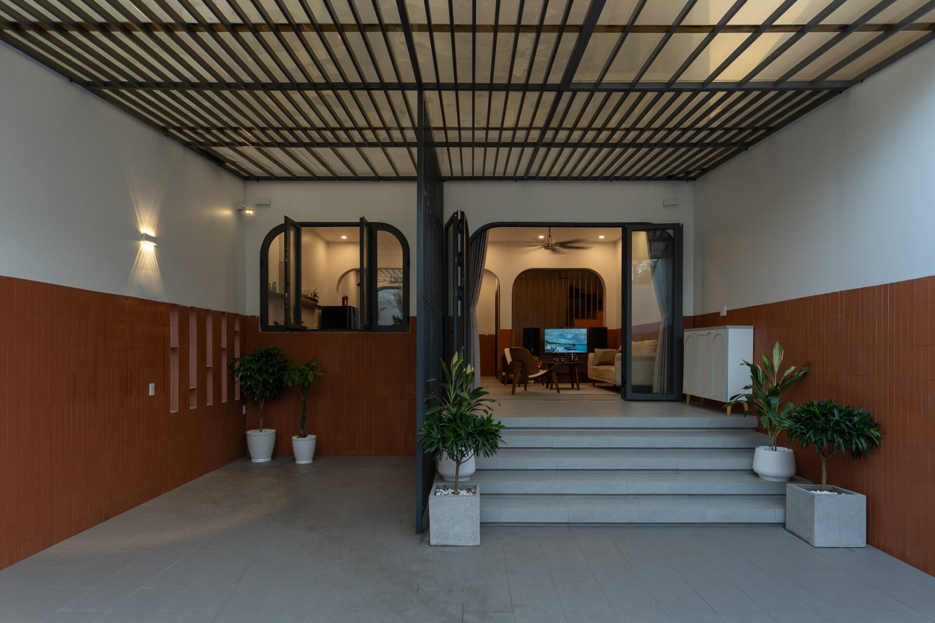 Khoảng sân trước rộng dùng để xe và làm lớp đệm gió trước khi vào nhà. Gạch đất nung được kéo từ ngoài vào tạo cảm giác liền mạch và ấm áp.